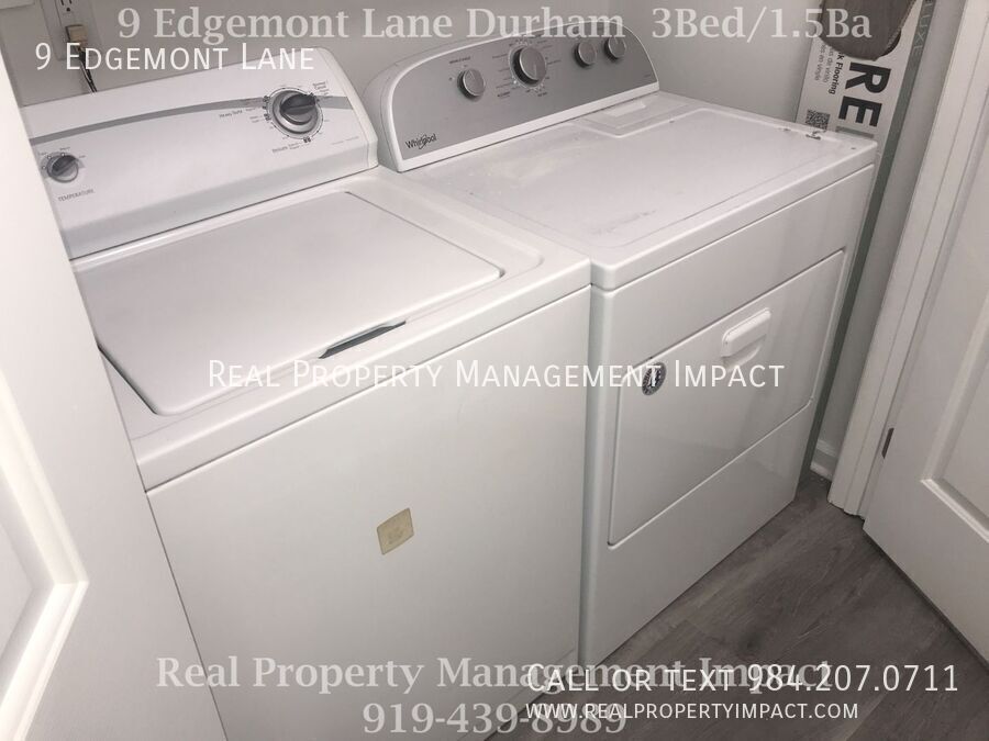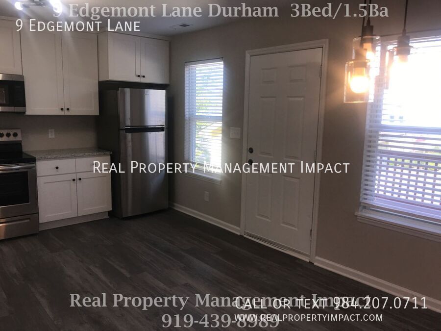 Urban Farmhouse upgrades: fresh paint, luxury laminate wood floors, and modern statement light fixtures. Cozy living room with focal lighting. Spacious, entertaining kitchen with white shaker cabinets, granite counter tops, rustic wood shelving, and stainless steel appliances. Eat in kitchen/dining room space leads to wood, grilling deck. Hallway laundry closet with washer/dryer included. Bedrooms all feature modern ceiling fan/light. Bathrooms updated in classic white with new fixtures and lighting. Easy to maintain yard. Backyard features a storage shed and new privacy fence. Welcoming front porch overlooks quiet, wooded cul de sac. Dedicated off street parking. Pets welcome. Wired with Ring security system. This home is the best of urban living - make it your own private retreat! Close to great restaurants, breweries, and shops. Local favorites include: Golden Belt (.4 miles), Ponysaurus (.5miles), Durham Central Park & Farmers Market (1.4 miles), Durham Bulls Athletic Stadium ( 1.3 miles), RDU (13.5 miles), and RTP (8.1 miles)