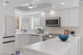 LUXE & FREE UNLIMITED GOLF An extraordinary CORNER END UNIT one-of-a-kind,LUXURY like no other. YEARLY $2995/MO. SEASONAL $6500/MO Enjoy sweeping natural light from every angle and views of High Point CC Golf Course and fountains from both the full wall of windows and from the serene glassed lanai. Natural light flows from every angle. A spacious Living Room features a custom wall unit with generous storage combining style and a sleek organized look to keep the space tidy and elegant. A 70” TV completes the sleek and stylish space along with all top-tier leather sofas with built in recliners in every seat to create a perfect space for relaxation. Custom-designed blinds throughout offer both privacy and style enhancing the overall design of each room and custom linen curtains frame the panoramic views of golf course and fountains. Porcelain Tile was chosen for all flooring which resists stains more than marble and is both luxurious and durable. The white modern kitchen with special lighting has 2 windows and boasts a full suite of Samsung appliances which are top-of-the-line. These premium appliances are highlighted by their sophisticated white glass fronts which blend seamlessly into this elegant space. Master Bedroom is enhanced with an enlarged custom closet system,extra closets and enlarged bath with a full storage wall of mirrored cabinets,both beautiful and functional. 2nd Bedroom/Office: Beautifully crafted custom designed Murphy Bed adds versatility to the space and offers an elegant space-saving solution for both office and occasional guests. All bathrooms feature modern mirrored cabinetry across the entire wall with storage behind each mirror cabinet to organize everyone and everything for practical convenience. A well appointed In-Unit Laundry Room is sleek and functional with shelving for all your storage needs. Come live in luxury and enjoy all the benefits of your High Point Country Club membership available immediately and at No Cost for golf,tennis and pickleball on the newest courts in Naples. The HPCC Clubhouse has a well stocked pro shop,a gym,library and in season restaurant plus a full activities calendar year round. Covered parking and extra storage is included and the use of 6 pools. All utilities are included except FPL electric. Enjoy modern comfort,convenience and amazing golf course views just a mile from the beach and minutes to restaurants,5th Ave,Waterside Shops,Venetian Village and Mercado. This is a 55+ building and at least 1 occupant must be 55+. Sorry no smoking and no pets are allowed. YEARLY $2995/MO. SEASONAL $6500/MO