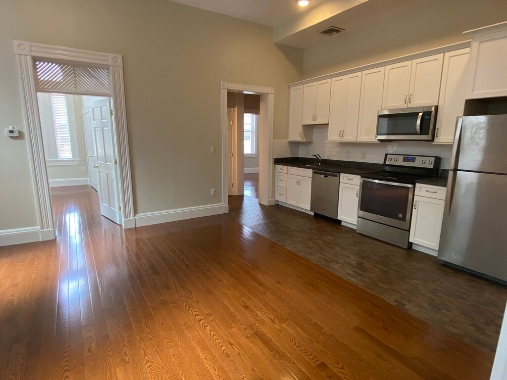Beautiful,modern 3-bedroom,2-bathroom unit located in the town's center! Steps to the commuter rail,shops and restaurants nearby. The unit ison the second floor,featuring an open floor plan with the kitchen (full stainless steel appliances) overseeing the dining area and living room,highceilings,large windows- great natural lighting,gleaming hardwood floors throughout,two full bathrooms,spacious bedrooms,generous closets,private in-unit laundry and central air and heat. The parking is availablein the municipal lot nearby. Non-aggressive pets will be considered. MLS# 73500245