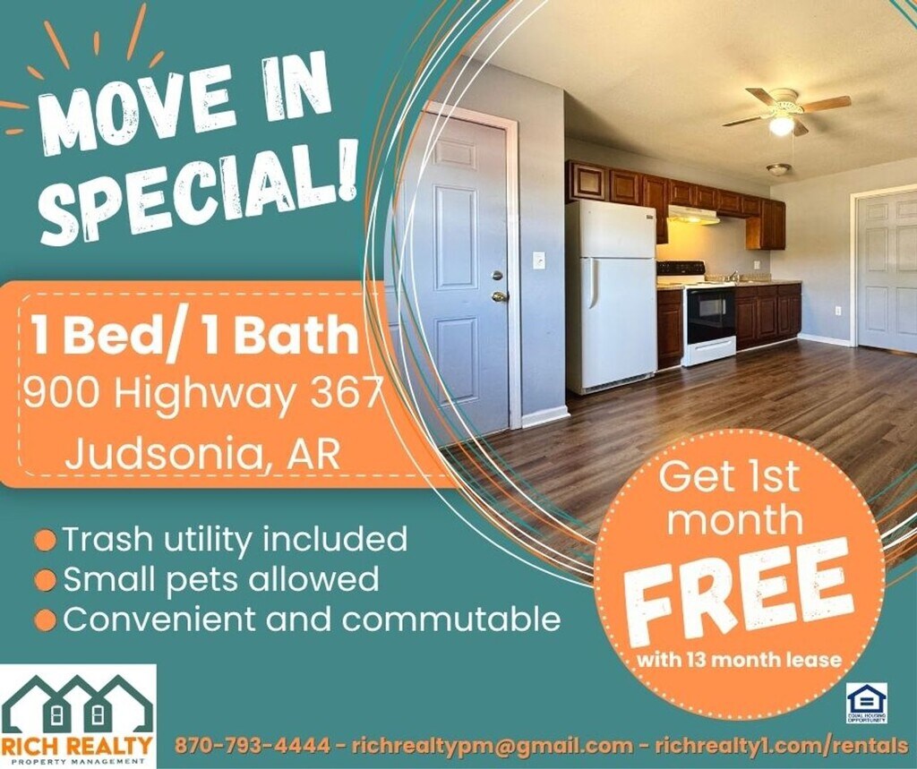 Welcome to the Little Red Apartments! These charming efficiency apartments are the perfect blend of affordable, attainable, and commutable for anyone looking for long term stability! Just down the road from great fishing at the Little Red River access OR in the pond behind the apartments. Onsite is Judsonia's only 24/7 laundromat and car wash. Call today to secure your spot! Trash included with the rent! MANAGED BY RICH REALTY OR *What we Look for in an Applicant* -Monthly take home pay at least 2.5x the rent (or proof of current HUD voucher) -500 minimum credit score with NO collections from landlords or utilities -No evictions or violent criminal history -Good references from previous landlords *Rich Realty requires all tenants to obtain a renter's liability insurance policy in the amount of $100,000* Equal Housing Opportunity Agent Owned