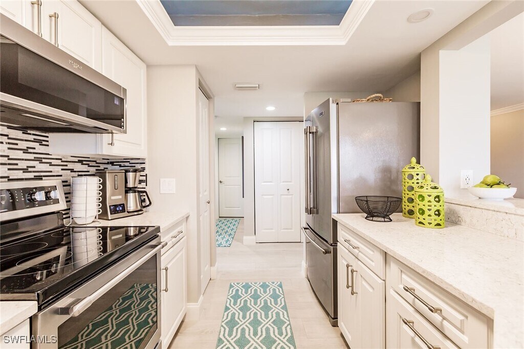 Welcome to your meticulously maintained,light,bright,fully renovated coastal-casual styled home away from home! This condo is located on the island's highly desired south end with Caxambas Bay views out your front door,and canal views out the back! Two bedrooms,and two full bathrooms,a tranquil primary suite with large closets and en suite bathroom. New queen sofa sleeper adds additional accommodations for your guests. Many high-quality finishes,including quartz countertops,stainless steel appliances,crown molding,LED lighting,fresh paint,and all new furnishings. Tile flooring throughout,new window treatments and in-unit washer/dryer. Ideal top-floor (4th floor) end-unit with a private,screened west-facing balcony offers a tranquil retreat at the end of the day for taking in Marco's famous sunsets The low-density,low-rise (24 units total) "Islander Cove" property has recently been updated,including a new seawall,docks/piers,paint,lobby area,and parking lot. This unit sits on top of a direct access waterway and has a new,deeded boat slip,and 6,000 Lb electric boat lift. If desired,bring your boat and utilize the boat lift right in your backyard. For an extra $150 per month,the slip includes the lift,water hose,and electricity on the dock.