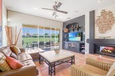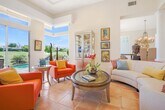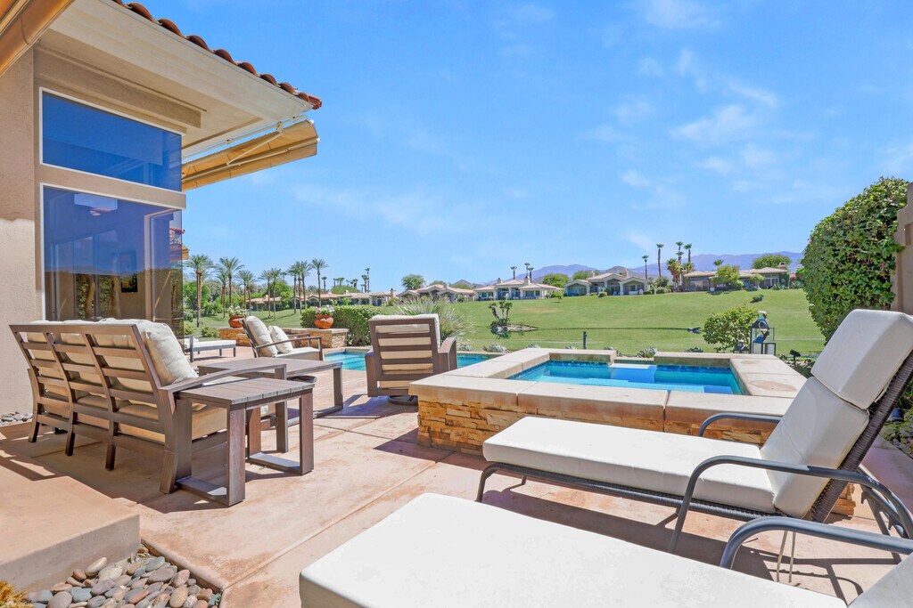 Lease available November 2025 - January 2026. Soak in Unmatched South-Facing Views! This beautifully updated Smoketree 5 model offers panoramic vistas of the Grove#4 fairway,shimmering lake,and majestic mountains. With 4 ensuite bedrooms and 4.5 baths across 3,562 sq. ft,this light-filled home blends modern style with desert luxury. The spacious south-facing patio is an entertainer's dream,complete with pool,spa,fire feature,built-in BBQ,and retractable awnings. Living,dining,and family rooms all flow effortlessly to the patio and share those stunning views. Enjoy a sleek kitchen with stainless steel appliances,wine fridge,large island,and breakfast bar. The primary suite is a true retreat with sitting area,dual closets(one walk-in),and spa-like bath. One guest room is used as a den/office with private patio access. Additional features include electric blinds,dual-sided fireplace,wet bar,built-ins,laundry room,and a 2-car garage + golf cart garage. Tenant has use of Owners golf cart and Club membership with membership approval and three month minimum. Landlord pays HOA monthly dues includes cable and internet. Landlord pays monthly caps on gas and electric. Fully furnished - just bring your suitcase!