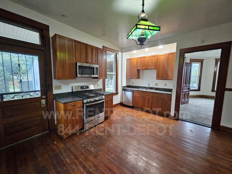 This charming, late Victorian 2-Story home offers amazing woodwork and lots of charm! The main living space offers a large entryway with a stunning staircase. This home features beautifully restored hardwood flooring and new carpet throughout, as well as a freshly painted interior for a clean and modern look. The living room boasts a beautiful fireplace with original pocket doors. The kitchen offers lots of natural light, plenty of cabinet space, with built-in microwave and a dishwasher. You'll find 1 full bathroom and a second staircase to the upper level. The upstairs provides 4 large bedrooms and 1 full bathroom, which is complete with a clawfoot bathtub. Outside, you'll find a fenced in backyard and a newer detached garage. It also features a large patio overhang. Other features and amenities include an unfinished basement, 10' ceilings, a rear deck covered patio, and so much more. You’re just a few short minutes drive from shopping, schools, and the rest of the city. At a Glance: Tenant pays utilities; lawn care & appliances not included Pet-friendly: $100 non-refundable fee, $25/month per pet + screening Limited Liability Insurance required ($15/month if purchased through us) Available now! Schedule a tour, watch a walkthrough video, or apply at Questions? Call or 844-RENT-DEPOT *Rental Criteria: Please visit: Amenities: dishwasher, fully fenced-in backyard, new carpet, updated window treatments, restored hardwood flooring, detached 2-car garage, freshly painted interior
