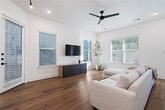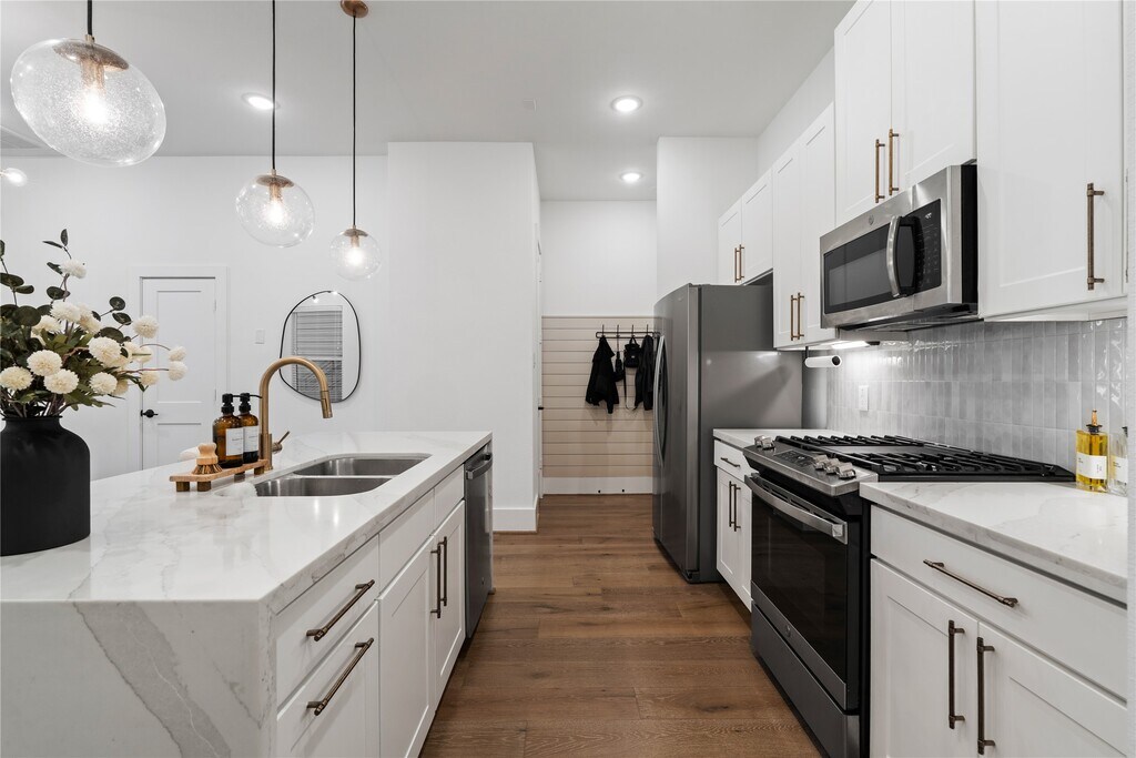 Located within a private,gated enclave in Spring Branch,9011 Wellspring offers a refined approach to modern living. This three-bedroom home spans 1,855 square feet and blends clean architectural lines with thoughtful functionality. Engineered hardwood flooring runs throughout,creating a warm and cohesive foundation across all levels. The main living floor is intentionally designed,allowing the kitchen,dining,and living areas to flow naturally while maintaining a sense of separation. The kitchen anchors the space with clean cabinetry,generous counterspace,and a layout suited for both daily living and entertaining. Large windows bring in natural light while preserving privacy. Upstairs,the primary suite provides a quiet retreat with an ensuite bath. Secondary bedrooms offer flexibility for guests,work,or personal use. Outdoors,a covered patio opens to a private turfed backyard. A private driveway completes a home that feels considered,comfortable,and effortlessly livable. MLS# 36725204