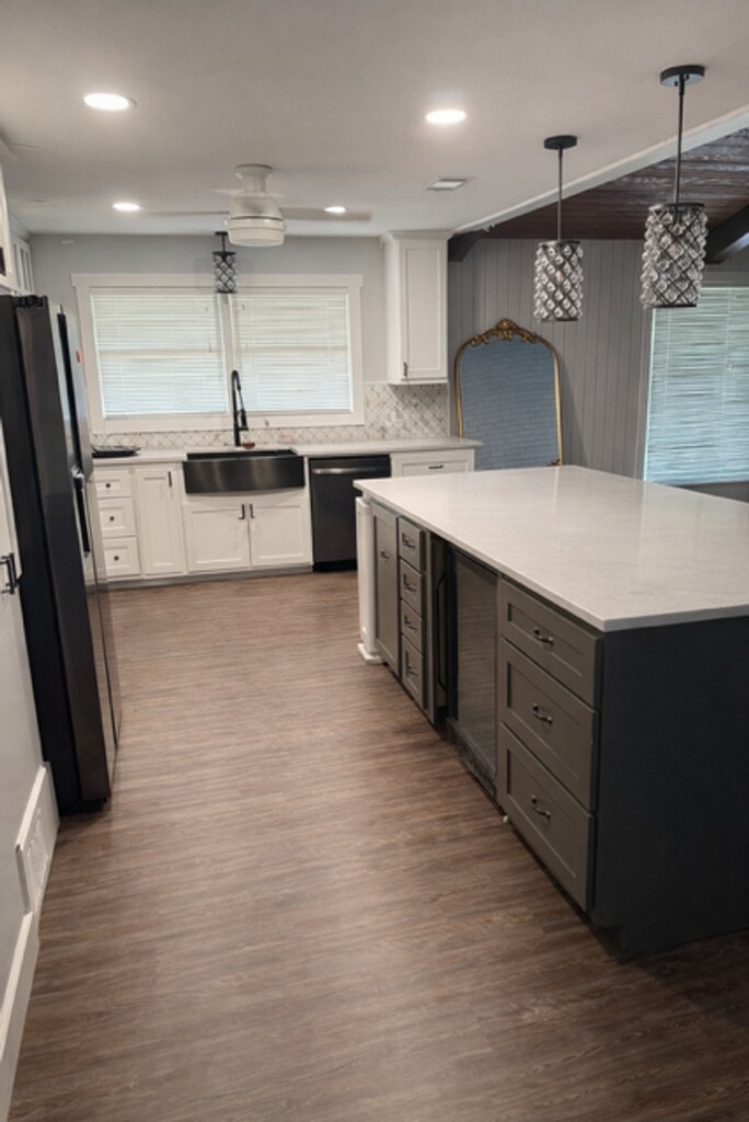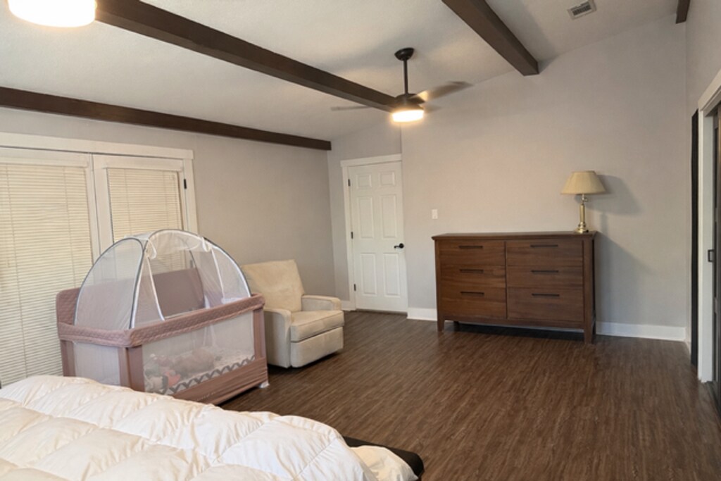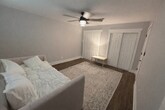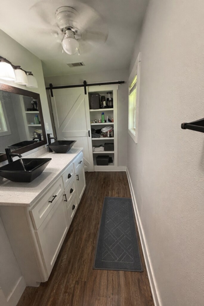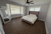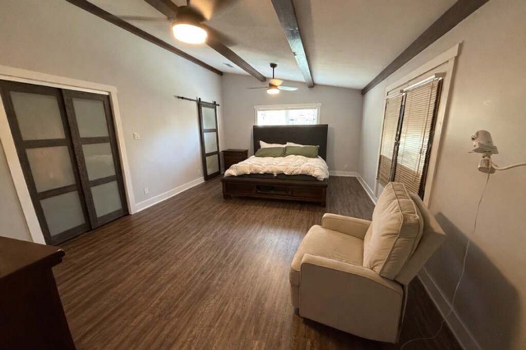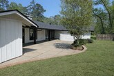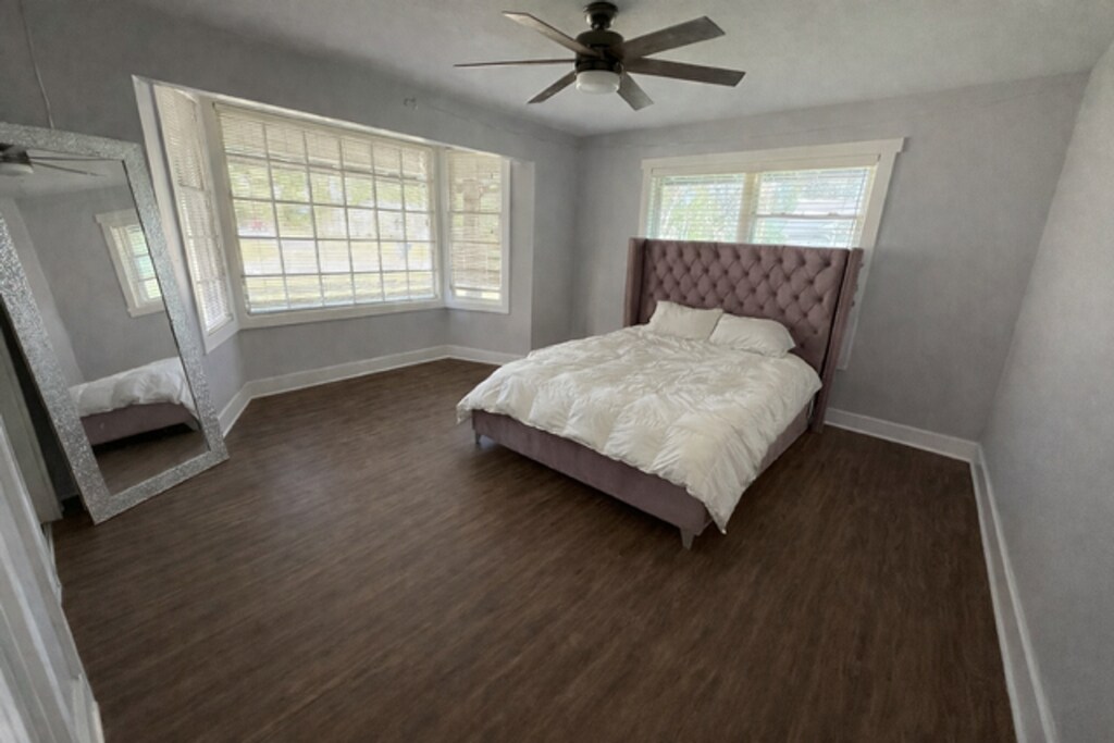 This updated vintage style 3-bedroom, 2-bath brick home offers about 2,359 square feet with a layout that feels unique, bright and full of character. It sits on a good-sized lot near the high school and includes a two-car garage, fenced yard, covered front porch, and a private courtyard-style patio in the back. Inside, the living room features a vaulted ceiling with wood detail, floor-to-ceiling picture windows, and a full brick fireplace wall. Wood-style flooring runs throughout the entire home, and the living and dining areas both have warm wood ceilings that add to the home’s style. The kitchen is spacious with a large island, dishwasher, stove/oven, and a sink set under a picture window. The primary bedroom includes wood beams and sliding barn doors that lead into the en suite bathroom, which has dual sinks, a separate toilet area, a shower, and built-in linen storage. There are two additional bedrooms, including one with a bay window, along with a guest bathroom that offers a tub/shower combo and a large vanity with dual sinks and plenty of cabinet and drawer space. The home also includes ceiling fans throughout and plenty of natural light from large windows. Small pets are accepted, with other pets considered on a case-by-case basis. Located close to schools and shopping, with an easy 30-minute drive to the Fort Polk main gate.