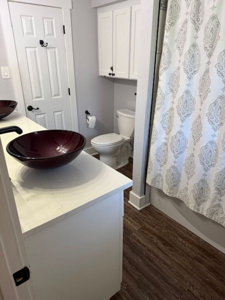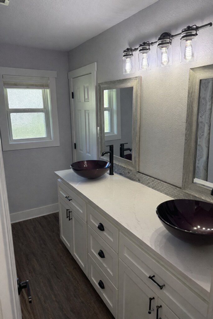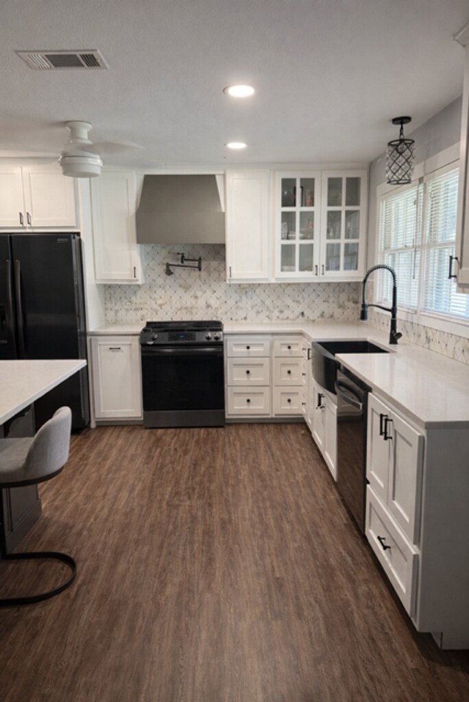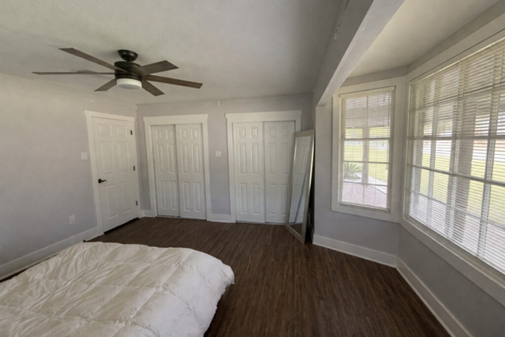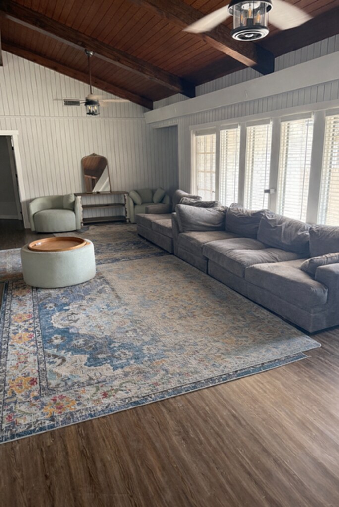 This updated vintage style 3-bedroom, 2-bath brick home offers about 2,359 square feet with a layout that feels unique, bright and full of character. It sits on a good-sized lot near the high school and includes a two-car garage, fenced yard, covered front porch, and a private courtyard-style patio in the back. Inside, the living room features a vaulted ceiling with wood detail, floor-to-ceiling picture windows, and a full brick fireplace wall. Wood-style flooring runs throughout the entire home, and the living and dining areas both have warm wood ceilings that add to the home’s style. The kitchen is spacious with a large island, dishwasher, stove/oven, and a sink set under a picture window. The primary bedroom includes wood beams and sliding barn doors that lead into the en suite bathroom, which has dual sinks, a separate toilet area, a shower, and built-in linen storage. There are two additional bedrooms, including one with a bay window, along with a guest bathroom that offers a tub/shower combo and a large vanity with dual sinks and plenty of cabinet and drawer space. The home also includes ceiling fans throughout and plenty of natural light from large windows. Small pets are accepted, with other pets considered on a case-by-case basis. Located close to schools and shopping, with an easy 30-minute drive to the Fort Polk main gate.