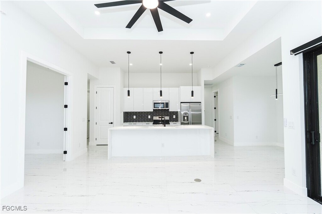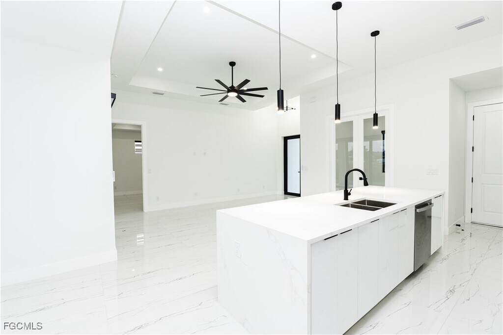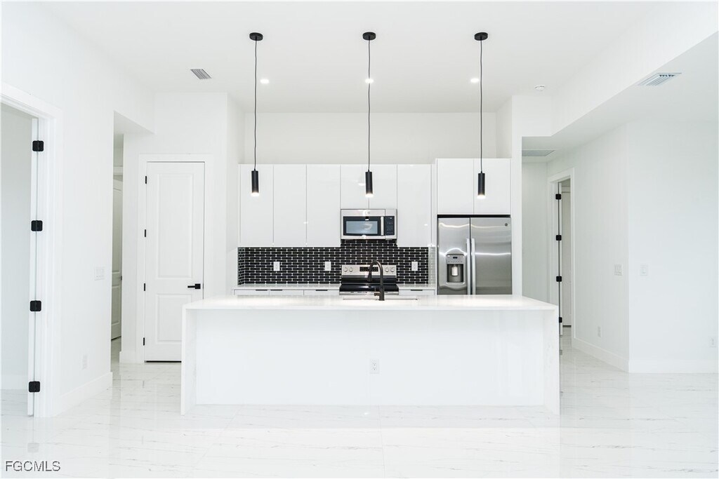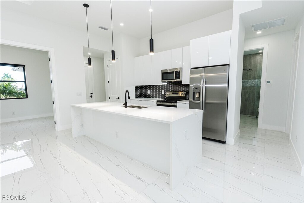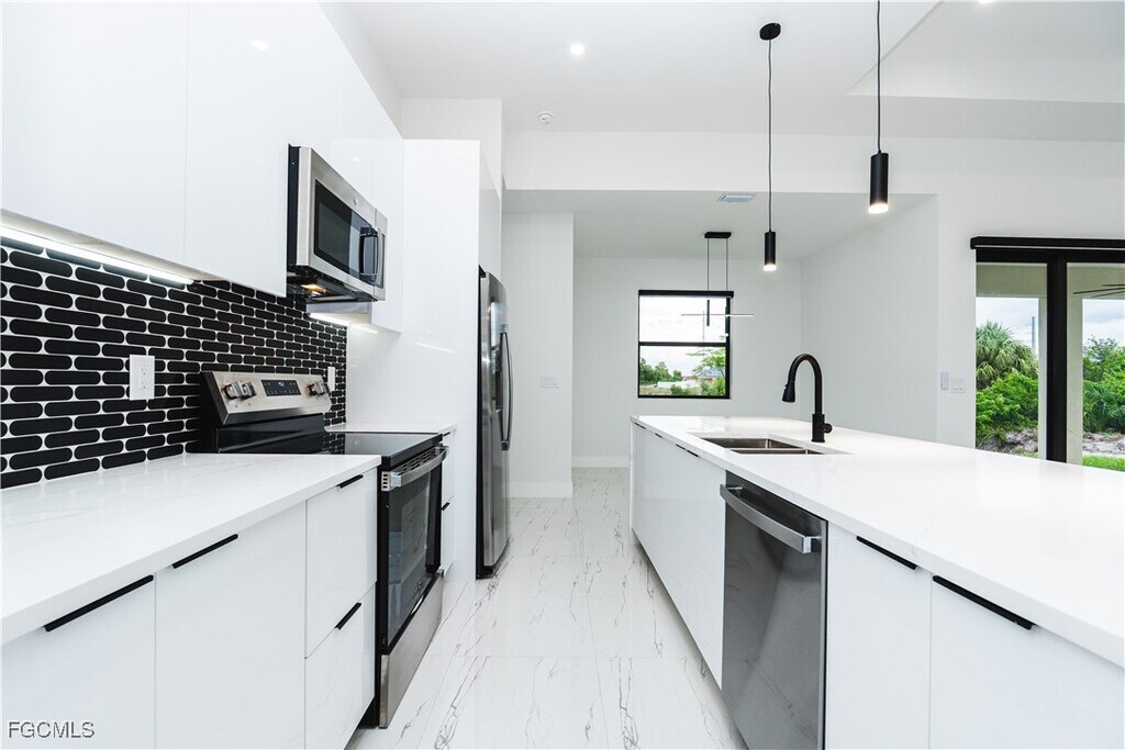 Beautiful newly built 3-bedroom + den,3-bathroom canal-front home,move-in and rent ready,located in a prime NE Cape Coral area with easy access to Del Prado Blvd,Pine Island Rd,Downtown Fort Myers,and Cape Coral. Features high ceilings,impact windows,a modern chef’s kitchen with quartz waterfall countertops,custom cabinetry,and stainless steel appliances. Spacious owner’s suite with walk-in closet and spa-style bath. Versatile den and one bedroom with private entrance and bathroom,ideal for guests or rental income. Covered lanai with peaceful canal views,2-car garage with epoxy floors,interior laundry room,NO HOA and no rental restrictions.