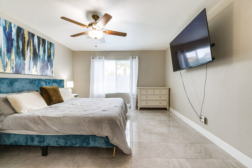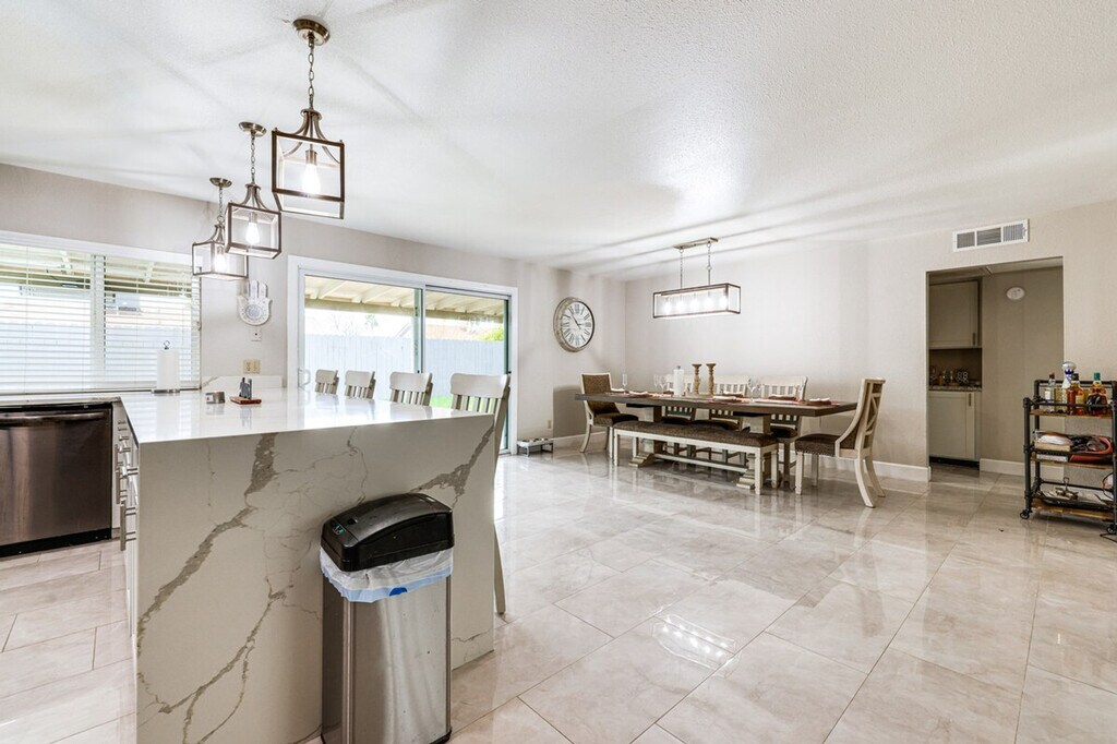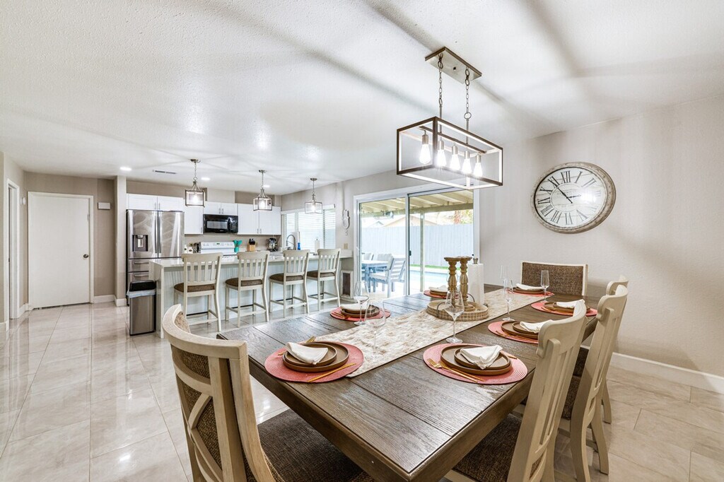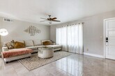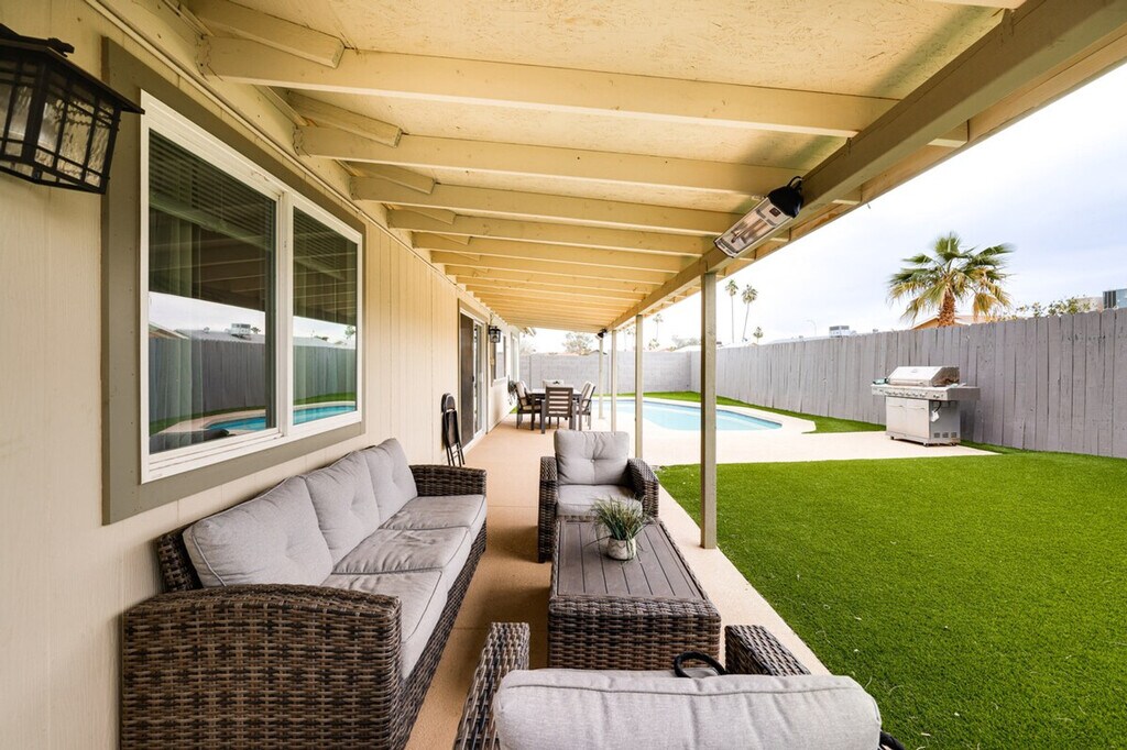 Discover a slice of desert paradise and feel at home in this spacious 3-bedroom, 2-bathroom house in Tempe, Arizona. This single-story home requires one small step for entry. This well-appointed home boasts a charming patio for outdoor dining, a cozy electric fireplace, and a private outdoor pool. The home is equipped with stainless steel appliances, a smart TV, an en-suite bathroom, a walk-in closet, a dining table, a bathtub/shower, a foosball table, ceiling fans, a stove/oven, a refrigerator, a microwave, a pantry with spices and snacks, a dishwasher, dishware/flatware, cooking basics, central air conditioning and heating, a washer/dryer, linens/towels, free Wi-Fi, hangers, a hair dryer, an iron/board, trash bags, and paper towels. Driveway parking is available for 2 vehicles, and free street parking is available on a first-come, first-served basis. With top attractions like the Phoenix Zoo and the Desert Botanical Garden just a short drive away, this home is the ideal home base for your Tempe adventures. Golfing is just 3 miles away. No events, parties, or large gatherings are allowed. This property features an external security camera facing out. By booking this property, you agree to comply with City of Phoenix Ordinance G-7156, section 10-204. Pursuant to Ordinance G-7156, this property requires a sex offender background check and you agree to provide any additional information required to confirm your eligibility to make this booking. [SI]