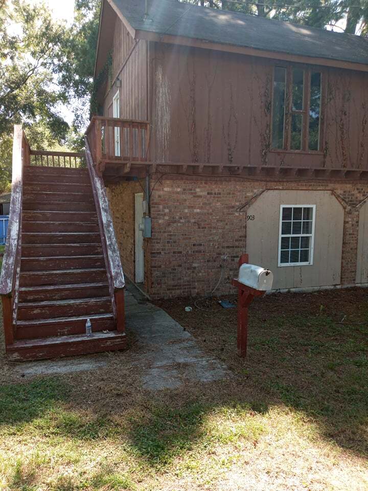 This is a cute unit that would be best suited for a single person or a couple due to its size. The upstairs contains one bathroom and a bedroom with a sitting area that opens to the upstairs balcony. The sitting area could also serve as a nursery or 2nd bedroom, which is why this unit is considered two bedroom. The downstairs contains the kitchen, living room and laundry hookup. The house is near the corner of River Rd and Walnut St, sitting off the road a bit.