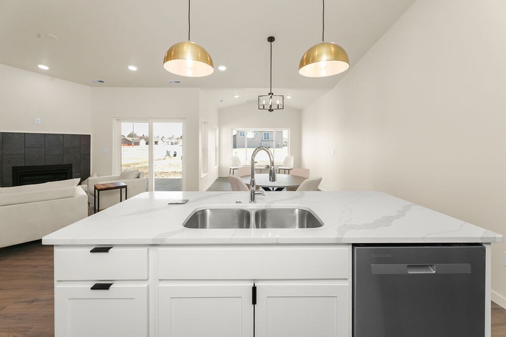 Modern new construction with premium finishes & a prime location. No steps in this stunning patio twin-home featuring vaulted ceilings and luxury vinyl plank flooring throughout. The kitchen and bathrooms boast with premium quartz countertops, while large windows flood the space with natural light. Entertain around the kitchen island or cozy up next to the beautiful gas fireplace. Primary suite w/ double sinks and glass door shower. The exterior is clad in low-maintenance steel siding, complemented by an insulated, finished garage. Located near schools, parks, and the hospital, this home offers convenience and comfort. Experience luxury living with minimal maintenance