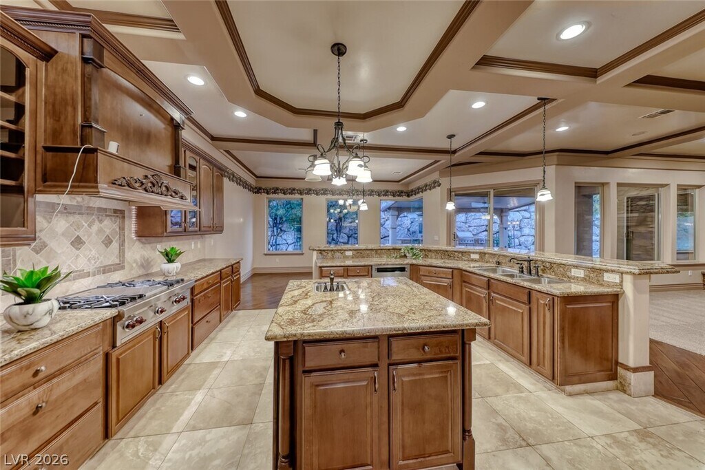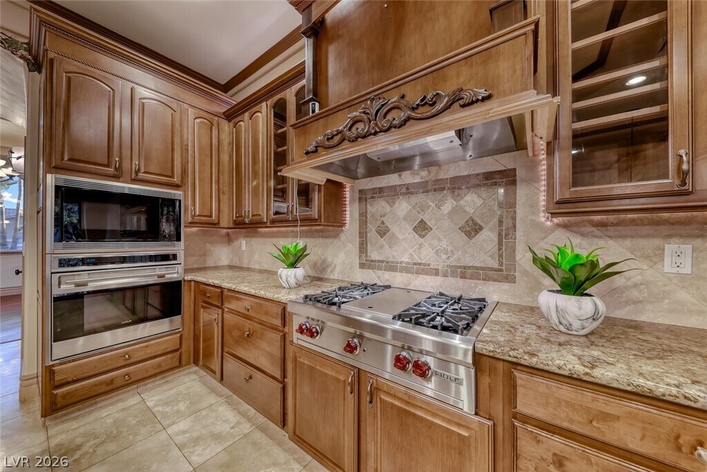 Stunning custom 2-story home nestled in the exclusive Two Crows at Calico Ridge! This impressive 3,694 sq ft residence offers 4 spacious bedrooms, 3.5 luxurious bathrooms, & sits on an expansive 10,454 sq ft lot. The chef’s kitchen is truly a showpiece, featuring high-end Wolf appliances, granite countertops, custom cabinetry, & a designer backsplash. Elegant marble & wood flooring flow throughout the home, complemented by new carpet in the family room. The bar area is also plumbed for a sink, perfect for entertaining. Enjoy seamless indoor-outdoor living w/ a covered patio, built-in outdoor kitchen, & breathtaking views of the Las Vegas Strip from the front balcony. Additional features include a striking wrought iron staircase, built-in refrigerator, washer & dryer, garage trash compactor, & a 2-car garage. The rental rate includes HOA dues, trash service, & landscaping, offering added value & convenience. Schedule your showing now! MLS ID 2774770