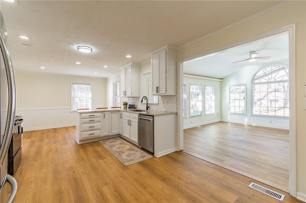What a fantastic home in a fantastic location! Welcome to 905 Tanglewood Trail in the well established community of Kingsridge Estates just 2 short miles from Bustling D'town Woodstock,convenient to 575,plus shops and restaurants of 92 and Woofstock Park are just outside your door! This true 4 bedroom,recently updated and expanded home is situated on a large corner lot (lawn care is included) with a full unfinshed basement,2 car garage,tons of storage space and room for a workshop. The main level features an entry foyer,formal living and dining rooms,expansive kitchen with an abundance cabinetry and granite counter space (microwave not pictured but is included),full pantry,b'fst bar with seating plus a separate informal dining area and all opens to the family/sunroom drenched in natural light with access to the new deck and fenced backyard! All 4 bedrooms on the main level. The primary bedroom has a private bath and walk-in closet,3 additional roomy bedrooms all have great closet space and access the updated 2nd full bath with soaking tub. Freshly painted interior,new hardwood floors,new carpet,new fixtures and upgrades through-out! New roof,newer systems,washer/dryer included,lawn care included,pets allowed. Look no further! Ready for you to call home.