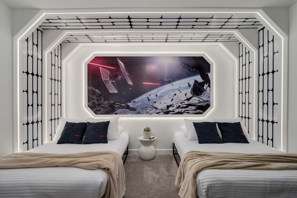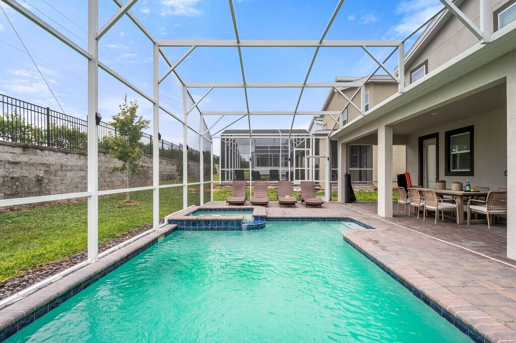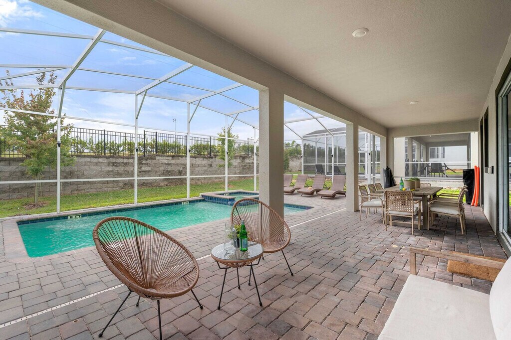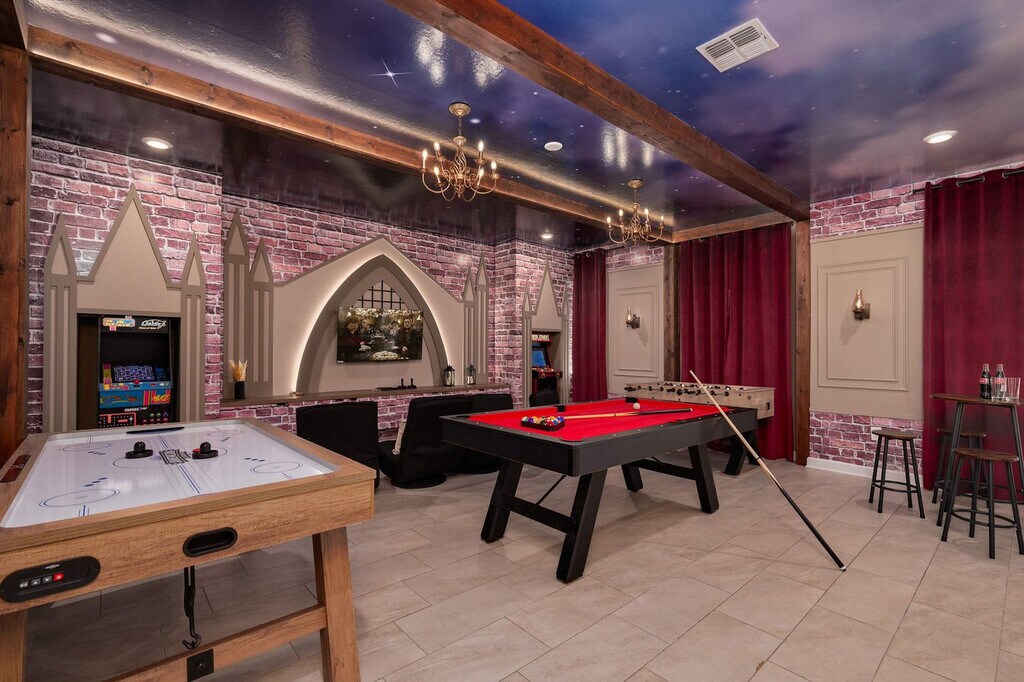 Welcome to your Disney retreat! Feel at home in this massive luxury villa located within the exclusive, guard-gated Champions Gate Resort, just 10 miles from Disney. This home is built for fun and comfort, sleeping up to 20 guests with 9 beautifully decorated bedrooms and 5 full bathrooms. This home features a spacious living area, a dining room, and a large full kitchen equipped with stainless steel appliances. Enjoy the game room with foosball, a pool table, and gaming. There is also a free washer and dryer. Step outside to the spacious indoor and outdoor dining areas and an outdoor patio with a grill and loungers. Enjoy a private pool and hot tub with the option to add heat for $35 per day of stay, with at least a week's notice. Free access to the community water park and amenity center/clubhouse is included. ChampionsGate is a gated masterplan community in ChampionsGate, FL. Enjoy a recreation-rich lifestyle with lavish amenities and nearby access to Orlando’s theme parks, like Disney World, along with shopping and dining at Posner Park. Plus, travel is a breeze with close by transportation and proximity to both I-4 and 27 freeways. Disney World is 10 minutes away, SeaWorld is 35 minutes away and Universal Studios is 40 minutes away. There is absolutely no smoking and no drugs allowed inside the home or elsewhere on the property. Only the number of guests indicated on the reservation are allowed to stay overnight on-premise, unless otherwise agreed upon in written form. The number of vehicles on the property should never exceed 3 per reservation. Be considerate while socializing outdoors after 10pm and before 8am and keep excessive noise to a minimum during this time. Failure to properly bag trash and dispose of it in the correct bin can result in fines up to $200. We reserve the right to terminate a reservation without refund, and/or pursue monetary fines if guests are found to be in violation of any of these rules. In the event you stay beyond the original scheduled check-out time, you may incur a fee of up to $300. [SI]
