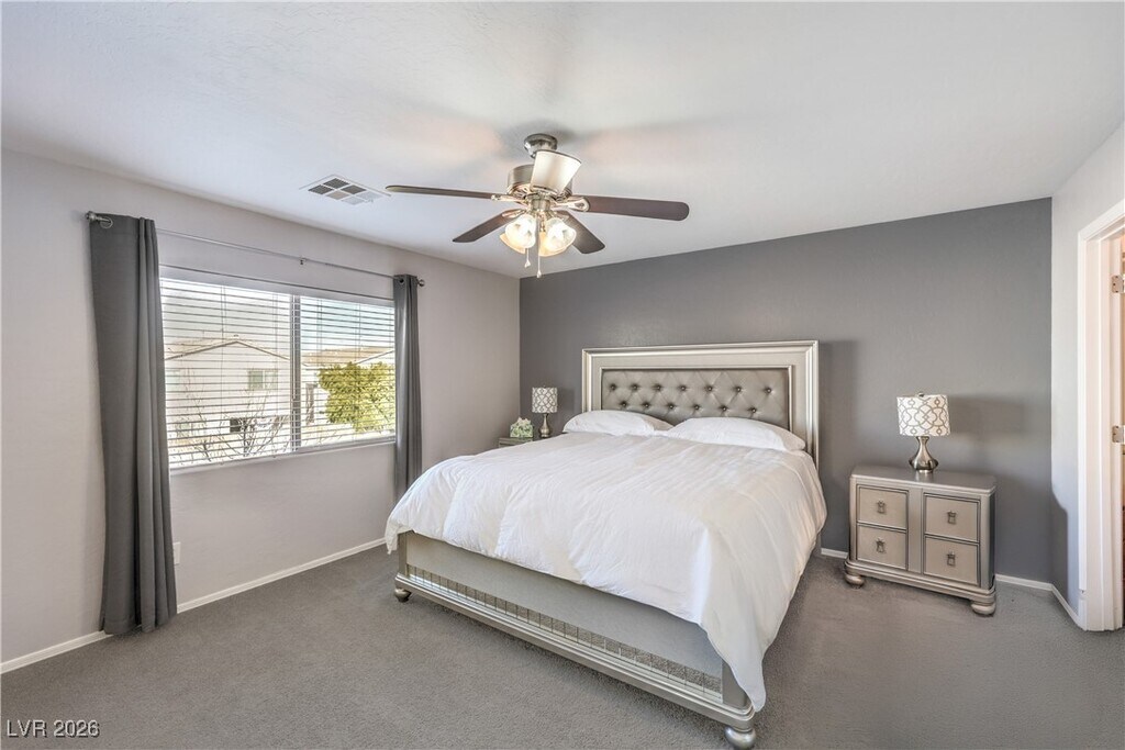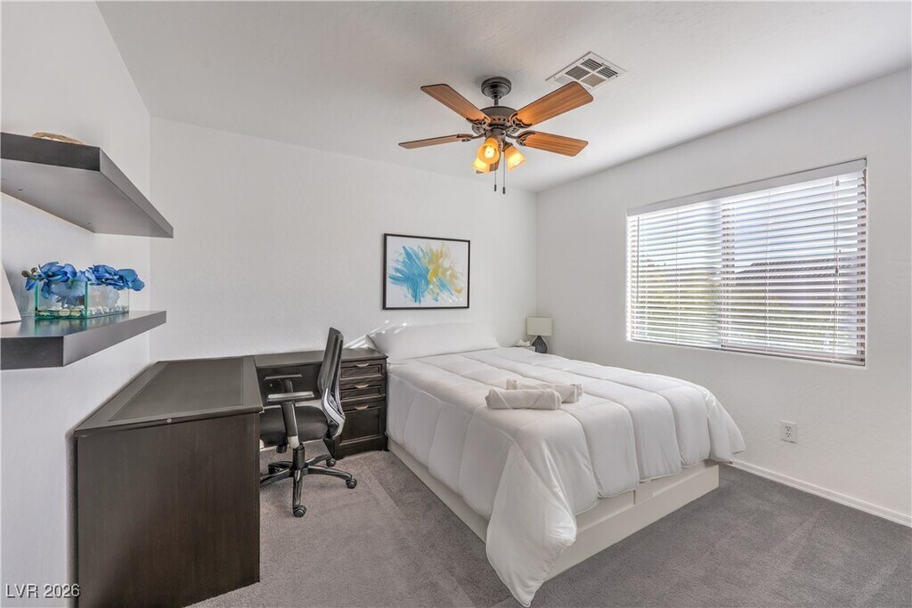 Beautifully maintained fully furnished two-story rental home in a desirable Southwest Las Vegas neighborhood! This spacious residence offers 5 bedrooms and 2.5 bathrooms with a functional layout designed for comfortable living. Enjoy open, light-filled living areas with neutral finishes throughout. The kitchen features ample cabinet space, a large pantry, and generous countertops—perfect for everyday use and entertaining. The primary suite includes an en-suite bath and great closet space, while the additional bedrooms are well-sized and flexible. Sleeping setup includes 1 king bed, 1 queen bed, and 3 full beds. Additional highlights include an attached 2-car garage, indoor laundry, and a private backyard with a grill and outdoor seating—ideal for relaxing or hosting. Conveniently located near parks, shopping, dining, and 20 minutes from the strip!