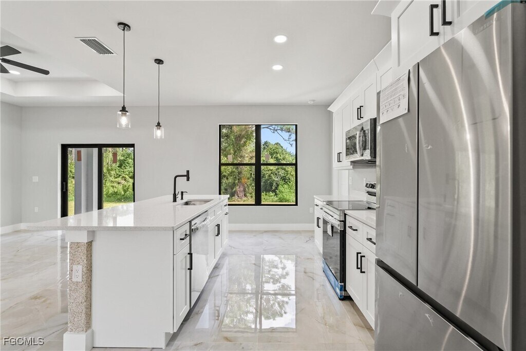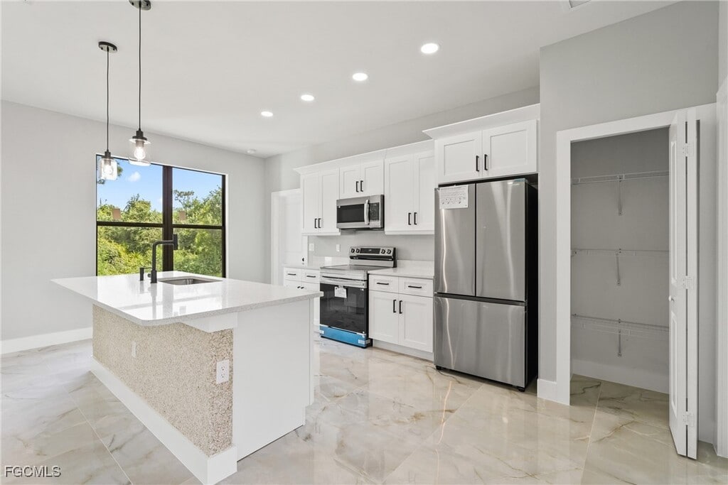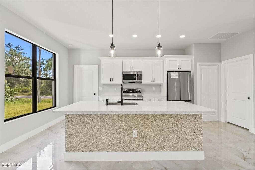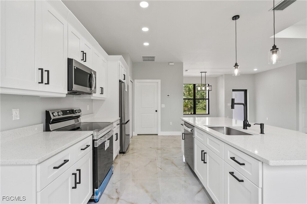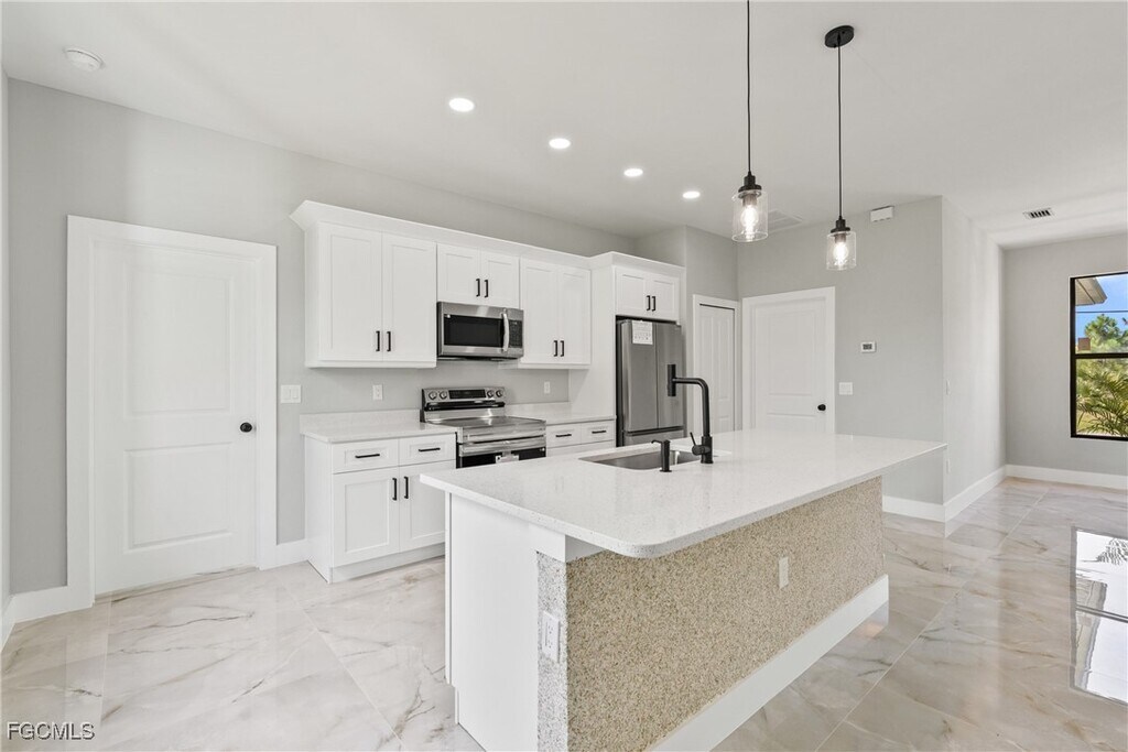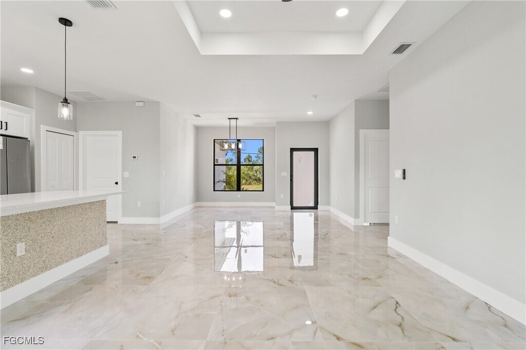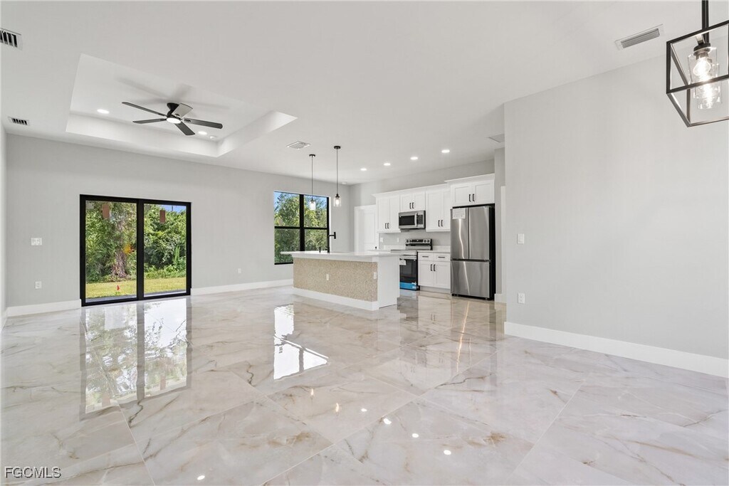 Stunning New construction in desirable Lehigh Acres featuring 3 bedrooms,2 bathrooms,Corner lot with sprinkler system and stylish modern design,ceiling fans,upgraded light fixtures. This home offers porcelain tile throughout,lanai under truss to relax and enjoy. quartz countertops,stainless steel appliances,and a spacious kitchen with a waterfall island pantry,utility room inside residence,Enjoy outdoor living with a lanai under truss,plus in-house laundry and contemporary finishes throughout. Conveniently located near shopping and dining—schedule your private showing today!
