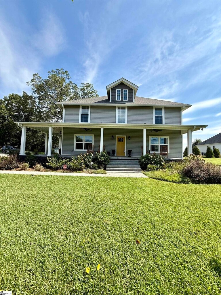 Beautifully renovated farmhouse style home situated on a 2 acre lot with a partial wrap around front porch. Home has beautiful hardwood floors and tile throughout. The kitchen is open to the dining room and the entire main living area with lots of natural light. Stainless steel appliances and marble countertops. The laundry room is oversized with washer and dryer connections, sink, counter space and cabinetry. Office space and half bath are located downstairs off the laundry room. Two bedrooms and full bath are located downstairs away from the main living area. The upstairs has a large hallway opening to 3 other bedrooms and bathroom. Primary suite is located upstairs. Master bathroom features a large walk in glass shower with rainhead and a separate soaking tub with electrical fireplace that can be viewed from the shower or tub. Upstairs has a walk in storage closet with attic access for additional storage. Outside features a patio with a firepit and an inground pool to provide you with the outdoor living spaces. Call to schedule your showing!