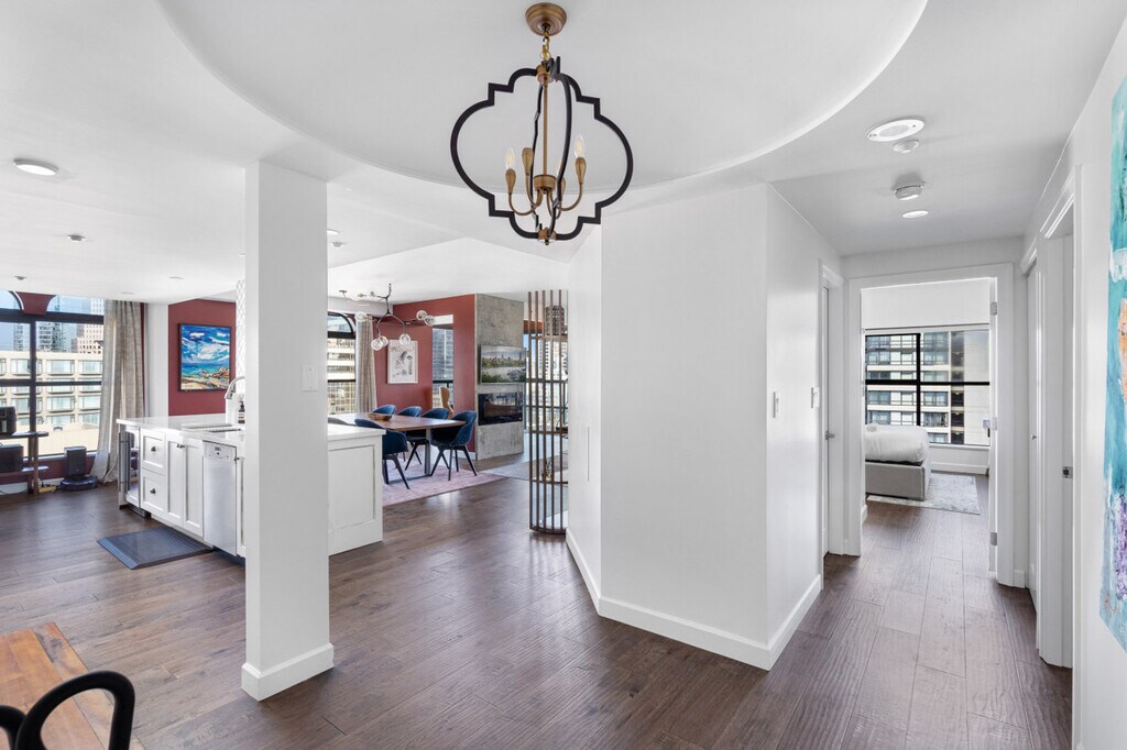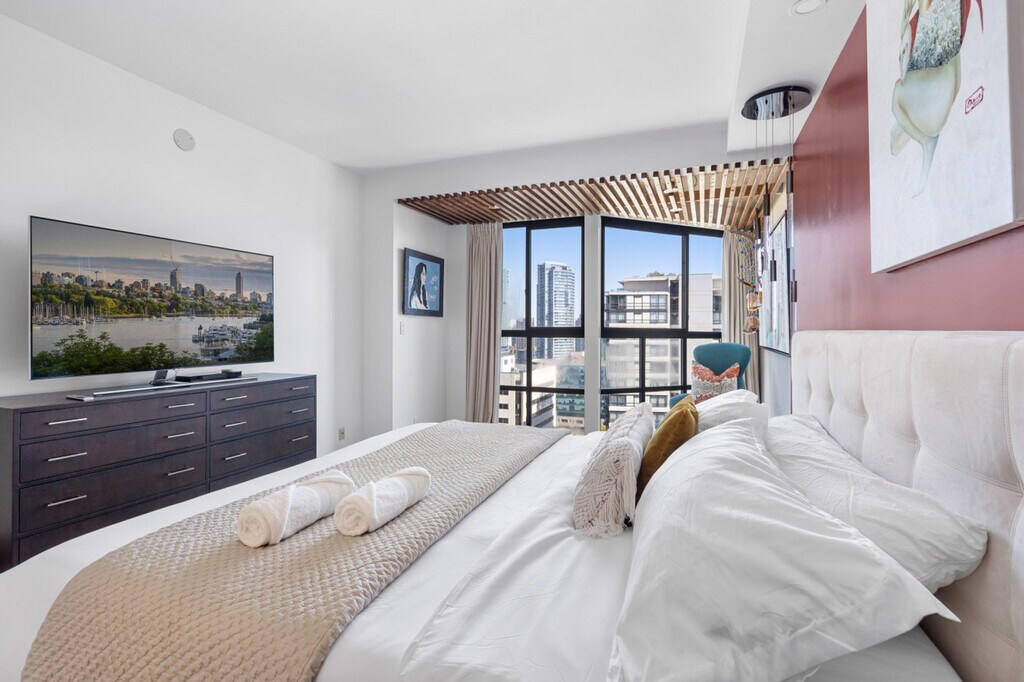 Feel at home in this elegant 3-bedroom, 3-bathroom designer residence located in downtown Vancouver. Curated for comfort and style, this apartment offers sweeping city views, a spacious walk-in closet, and a work-from-home layout, all complemented by refined furnishings. This apartment boasts a thoughtfully designed space with refined furnishings, ensuring a comfortable and stylish living experience. Premium building amenities include a pool, hot tub, and gym. No smoking and no parties or events are allowed. [SI]