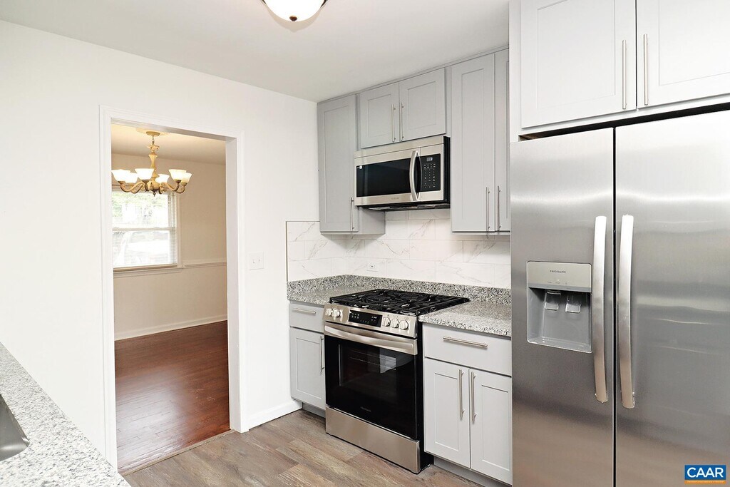 Move-in Ready! This newly renovated 3 bedroom, 3 bath downtown residence offers convenience to shopping, dining, entertainment, and the University of Virginia. Just a short drive from 5th St Station, I-64 access, outdoor recreation at Biscuit Run Park and Saunders Monticello Trail, and more! Plus, public transportation is just steps away. Step inside this 2,198 sqft home and be greeted by refinished hardwood floors that flow throughout, an open and spacious living room, a separate dining room, an eat-in galley-style kitchen with luxury vinyl plank floors, granite countertops, and high-end stainless steel appliances, and a large family room with a decorative fireplace. A primary bedroom with an ensuite full bath, and two additional bedrooms that share a custom tile bath are set along the hallway. Enjoy the convenience of an in-unit front-load washer and dryer. The garage has been converted into a beautiful studio space, ideal for an in-law suite or home office. The studio features luxury vinyl plank flooring, a fully-equipped kitchen with granite countertops and stainless steel appliances, a combined living/bedroom area, a full tile bath, and a stacked front-load washer and dryer. No pets allowed.