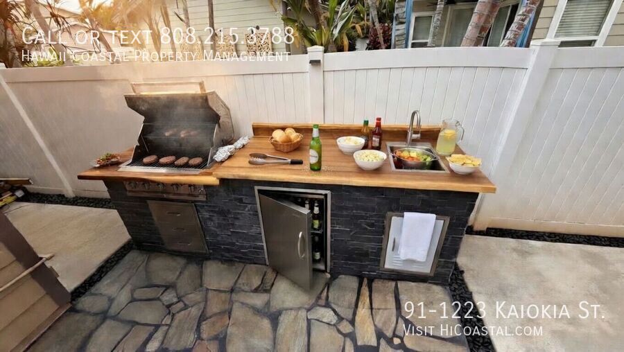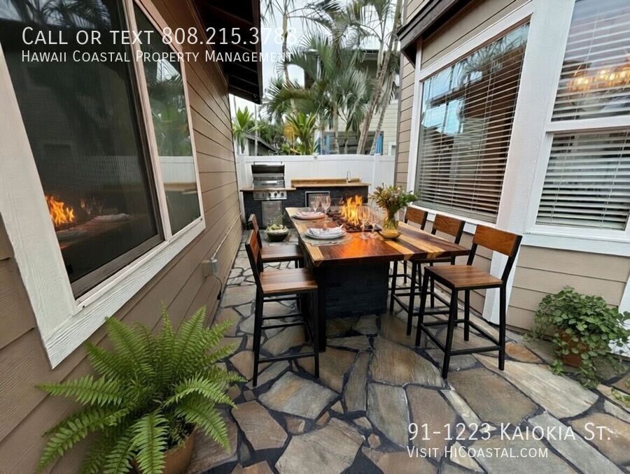 Available now in Ka Makana at Hoakalei — one of Ewa Beach's most desirable resort-style communities. This 4-bedroom, 3-bath single-family home sits on a premium corner lot with an oversized yard, detached garage, and three dedicated parking stalls. The home features 32 owned solar panels paired with 2 Tesla Powerwall batteries, which means your electric bill in the most expensive electricity market in the country will be close to zero — a real savings of $300 to $500 per month compared to homes without solar. Central AC, modern finishes, and a ground-floor bedroom and full bath round out the interior. Step outside and this property really separates itself. A full outdoor kitchen and dining area with a gas fire pit table turns the backyard into the room you'll use most. The corner lot gives you the yard space that's nearly impossible to find in this community — room for kids, pets, and the kind of outdoor living people move to Hawaii for. As a Ka Makana resident, you'll have access to the community's resort-style pool, spa, fitness center, pickleball and tennis courts, dog parks, playgrounds, and walking paths, with basic cable, internet, water, and sewer included in the HOA. Minutes from Ka Makana Ali'i shopping, beaches, golf, and Wai Kai, with an easy commute to Pearl Harbor, Schofield, and Shafter. Homes with this combination of solar, outdoor living, space, and community amenities don't last heading into PCS season. Schedule a showing today. At Hawaii Coastal Property Management we strive to provide an experience that is cost-effective and convenient. That’s why we provide a Resident Benefits Package (RBP) to address common headaches for our residents. Our program handles identity protection, pest control, air filter changes, credit building, rent rewards and more at a rate of $39.95/month, added to every property as a required program. More details upon application. Total monthly cost of rental will be Rent Amount+$39.95+4.712% GET Apply today at Connected Internet Sewer Fee Telephone Underground Electricity