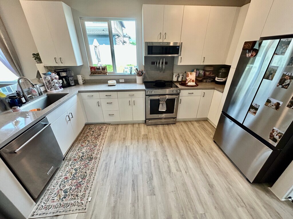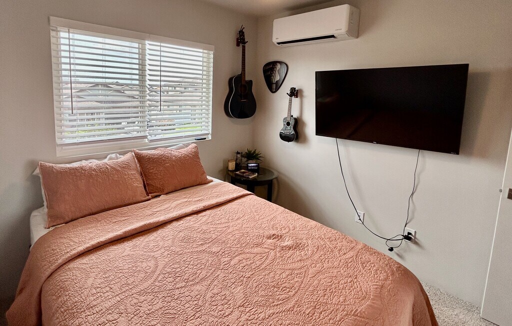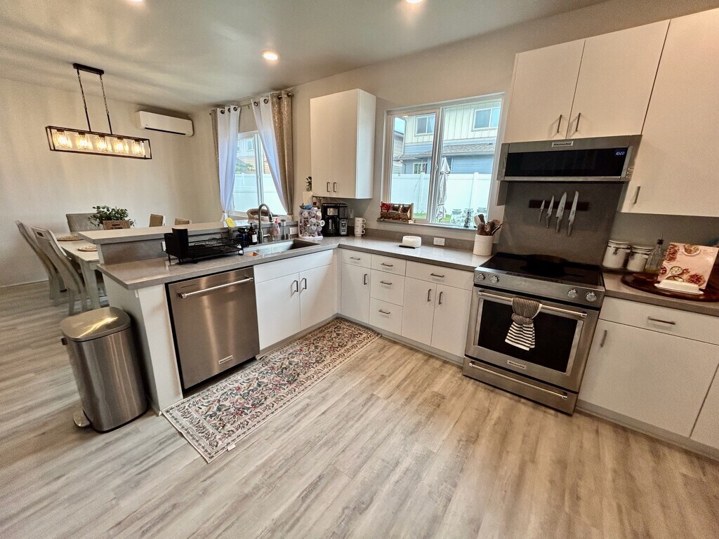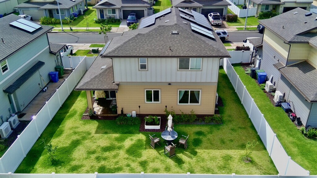 Newly built in 2024, 91-4088 Hikuha St is a pet friendly, two-story, fully fenced in, and furnished 4 bedroom, 2.5 bathroom home in Kapolei. The downstairs living area is open and spacious, with high ceilings, lots of natural light, large split AC, and a kitchen that opens right into the dining and living spaces. The kitchen has stainless steel appliances, plenty of counter space, and a large island. The home is being offered furnished. This well-chosen furniture fits the house nicely without making it feel crowded. The bedrooms all have their own split AC's, are well sized, and the bathrooms have updated finishes. The primary bathroom has a double vanity and a large shower with a walk-in closet. An additional office space is located upstairs. There is also a garage, driveway parking, PV, and two Tesla batteries, which can make a big difference for power use and convenience. This home also includes Smart home upgrades, such as smart light switches, SkyBell doorbell and a keyless entry. Outside, there is a fenced yard with outdoor furniture and room to enjoy. This home is also located in a newer Kapolei community with access to the SoHo Community Center, including a pool and recreation area. Conveniently located near shopping, dining, and the rest of the growing Hoopili/Kapolei area.