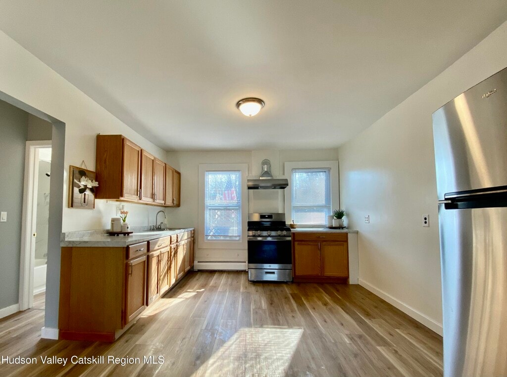 Located in one of Kingston's most vibrant and desirable neighborhoods,this top-floor apartment offers abundant natural light and sweeping seasonal views of the Hudson River. Perched just above the dynamic Rondout waterfront district,this unit places you moments away from award-winning restaurants,boutique shops,galleries,and scenic walks along the river. Completely renovated,the apartment features new flooring,a fully updated kitchen with modern appliances,a refreshed bathroom,and fresh paint throughout. The spacious layout includes two generously sized bedrooms,a separate home office or flex space,and ample storage,creating a bright and functional living environment. Whether you're seeking the energy of a walkable downtown or the tranquility of river views from your windows,this apartment blends comfort,convenience,and style in one exceptional package. Immediate occupancy available—schedule your private showing today. Street parking,No laundry in unit,No Smoking,No pets unless service