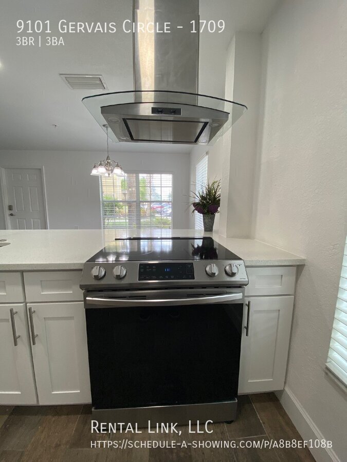 This bright and inviting 3-bedroom, 2.5-bathroom townhome offers comfortable living in the desirable Vista Townhomes at Heritage Bay community. Featuring 1200 square feet of living space, this well-maintained home blends modern updates with everyday practicality. The main floor features a spacious open-concept layout with wood-look tile flooring, a large living and dining area, and a beautifully renovated kitchen. The kitchen includes white shaker cabinets, sleek quartz countertops, stainless steel appliances, and a large breakfast bar that opens to the dining space, perfect for entertaining or casual meals. A half bathroom is conveniently located on the first floor for guests. Upstairs, the primary bedroom offers a walk-in closet and a private bathroom with a tiled walk-in shower. Two additional bedrooms share a full bathroom with a combination tub and shower. All bedrooms feature durable laminate flooring, providing a clean and cohesive look throughout. A laundry area with a full-size washer and dryer is also located upstairs for added convenience. Vista Townhomes at Heritage Bay offers residents a community swimming pool, lake views, and well-kept common areas surrounded by lush landscaping. Located in North Naples, this home provides easy access to shopping, dining, schools, and major roadways. Beautiful Gulf beaches and the best of Naples’ amenities are just a short drive away.Plank Flooring Range Hood