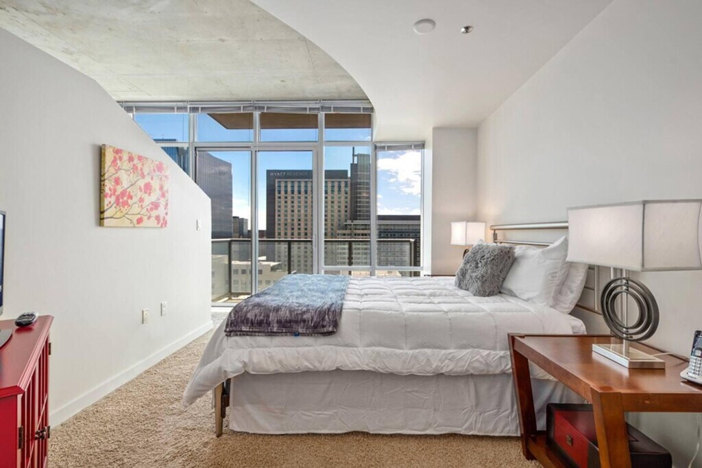 Feel at home in this stunning 1-bedroom, 1-bath condo located on the 27th floor of the Spire, one of the tallest LEED-certified residential buildings in the western United States. With 893 square feet of space, 10-foot ceilings, and floor-to-ceiling glass, this condo offers breathtaking views and a modern living experience. Enjoy the luxury of slab granite countertops, stainless steel appliances, and European-style cabinetry in the kitchen, along with ultra-high-speed structured wiring. The condo features concrete ceilings, hardwood floors in the entry, dining room, and kitchen, and carpet in the living room and bedroom. Relax on the balcony or enjoy entertainment on the flat-screen TVs in both the living room and bedroom. A full-size washer/dryer and an assigned parking space add to the convenience. This condo is thoughtfully designed to provide a comfortable and stylish living space. The large dining room table is perfect for entertaining, and the queen bed in the bedroom ensures a restful night's sleep. The kitchen is fully equipped with modern appliances and finishes, making it a joy to prepare meals at home. The condo includes one assigned parking space for your convenience. Located directly across the street from the Denver Convention Center and the Denver Center for the Performing Arts, this condo is just a few blocks from Larimer Square, Lower Downtown (LoDo), the Pepsi Center, Cherry Creek Bike Path, and the 16th Street Mall. Enjoy the vibrant neighborhood with its walkability and easy access to public transportation. Your stay includes a starter welcome packet with essentials like toilet paper, bar soap, shampoo/conditioner, paper towels, dishwasher detergent, trash bags, and laundry detergent. Any supplies beyond this are up to you to replenish, as restocking is not provided. Cleaning supplies are not stocked due to safety issues. [SI]