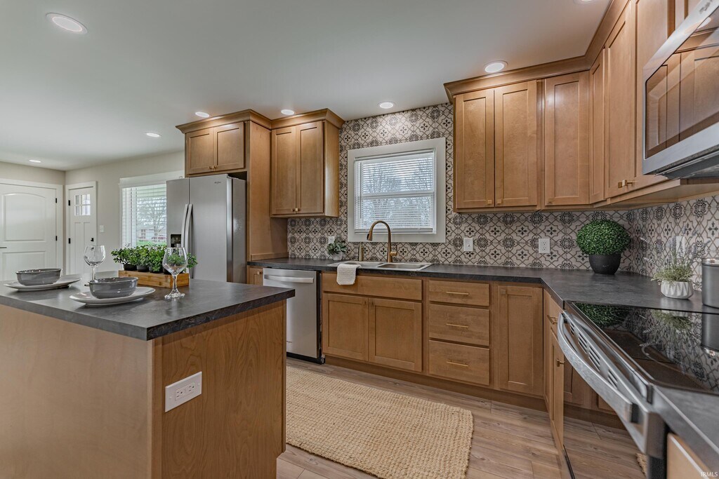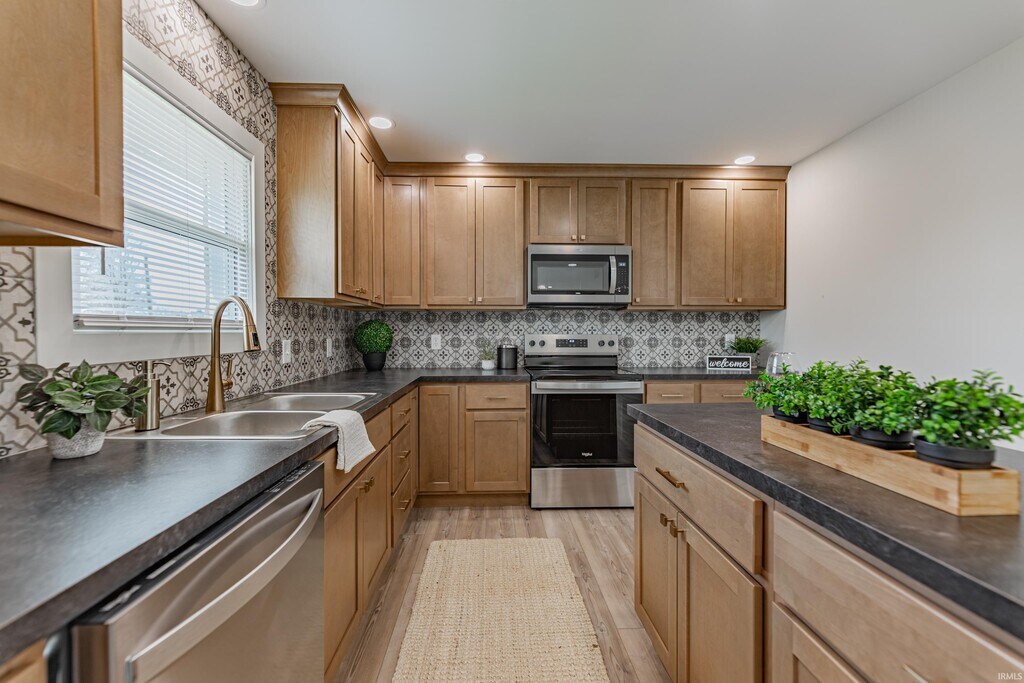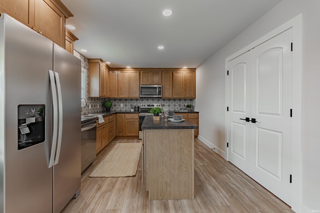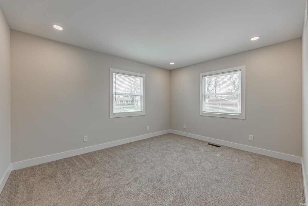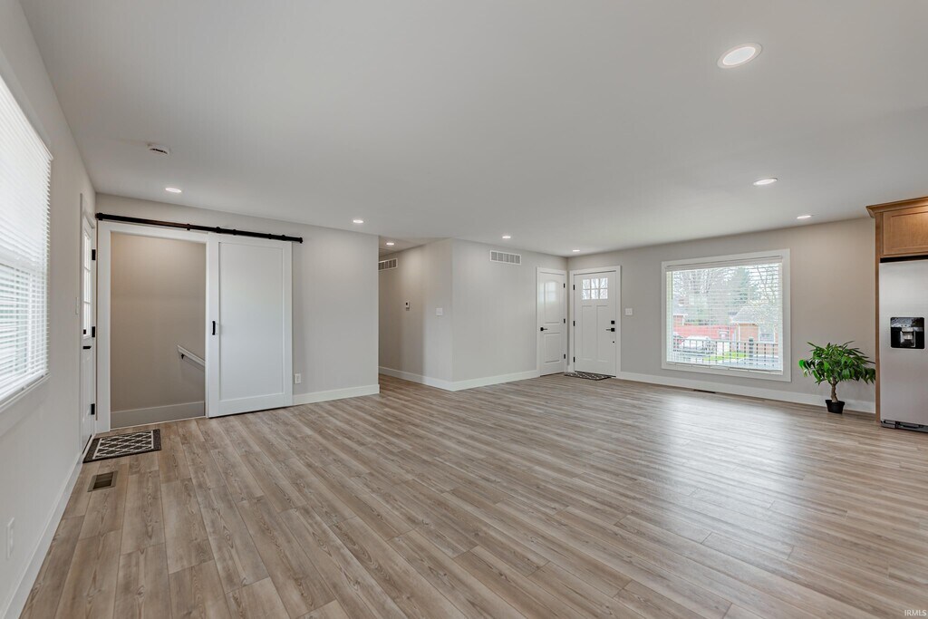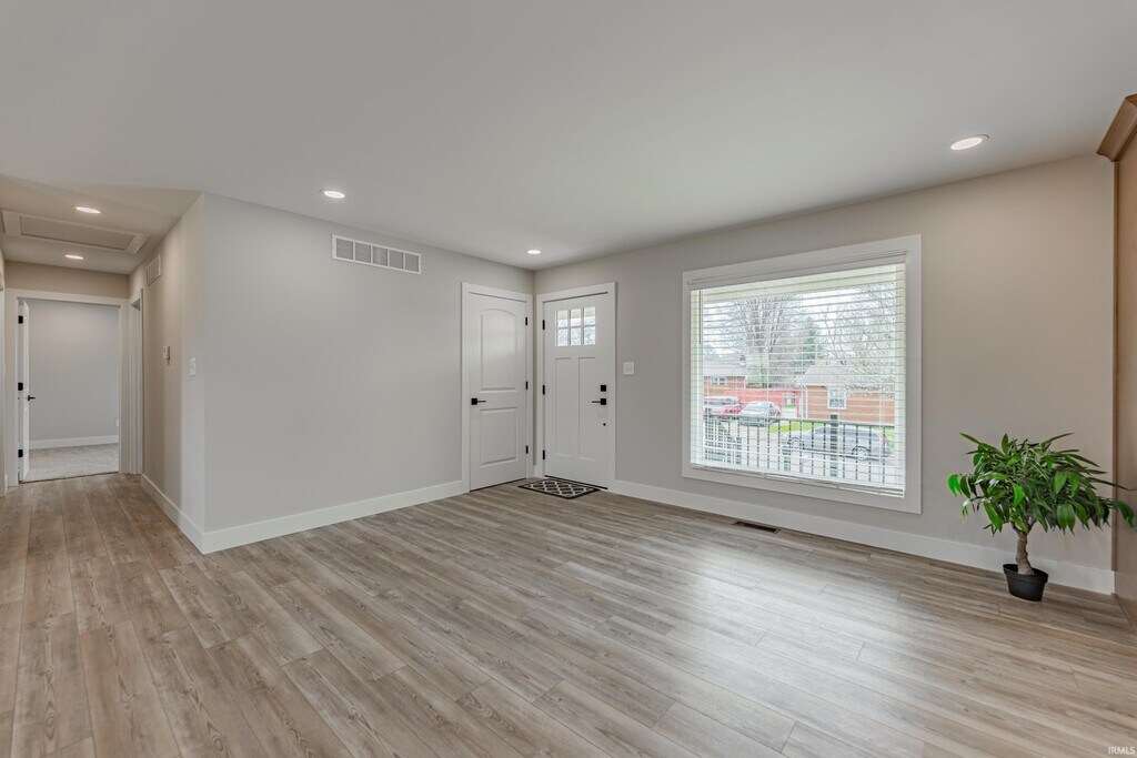 Completely transformed 3-bedroom ranch in Boonville! This beautifully updated home has been refreshed from top to bottom, including new drywall, flooring, a modernized kitchen, and fully renovated bathrooms, offering a clean, contemporary feel throughout. Step onto the welcoming covered front porch and into an open-concept living space featuring new luxury vinyl plank (LVP) flooring throughout the main areas. The updated kitchen showcases warm wood-toned cabinetry, stainless steel appliances, a convenient island that opens to the living area, and a spacious pantry closet. All bedrooms include new carpeting and generous closet space, while the primary bedroom features a tub/shower combination with stylish subway tile and a walk-in closet. The hall bathroom has also been fully updated from floor to ceiling with modern finishes. The home includes a large full basement offering plenty of additional space for storage or recreation, along with a private laundry room. Outside, enjoy a backyard with ample parking and room to relax or entertain—this move-in-ready home is a must-see! A two-year lease, matching security deposit, and approved credit/background check are required. No smoking. No pets. MLS ID 202610321
