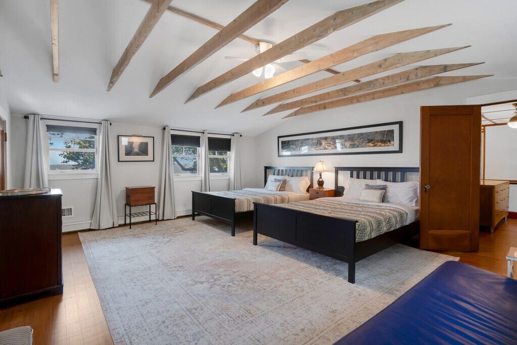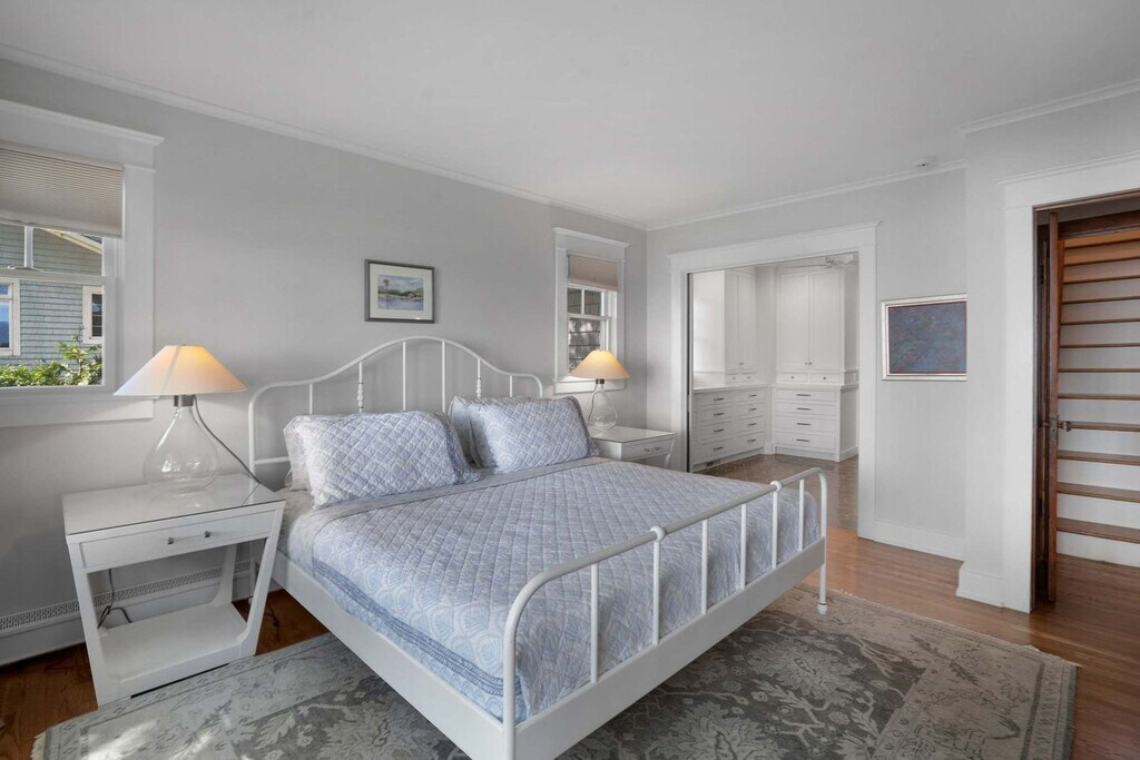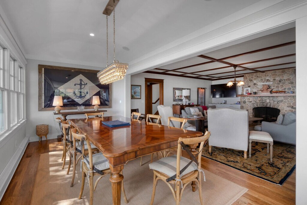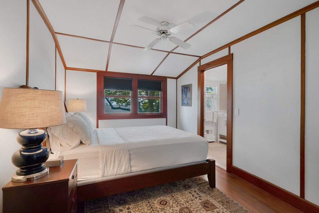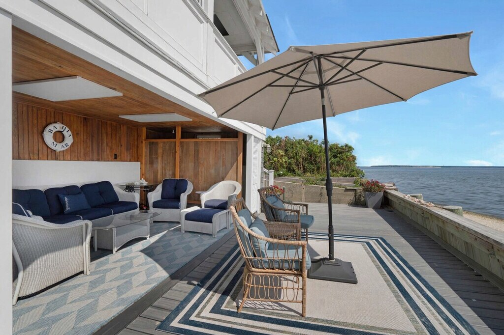 Feel at home in Bahia Mar, a serene 3-bedroom bayfront escape in Laurel, offering a rare combination of privacy and water views from almost every room. This private bayfront home features direct beach access and beautiful indoor–outdoor living spaces. This home offers a bright living area with floor-to-ceiling bay views, a large dining area opening to the lawn and water, and an open kitchen with an oversized island, butcher block top, brass fixtures, and bay views. The primary bedroom features a king-size bed and an en-suite full bathroom. The second floor includes a queen bedroom with garden views and a large room with two queen beds, vaulted ceiling, and exposed beams. There are also two upstairs full bathrooms. Outside, enjoy multiple lounging and dining spaces, a fire pit, and a hydrangea-lined garden path leading to the front entrance. A hot tub overlooking the Peconic Bay is available. From Columbus Day to Memorial Day, most outdoor items are stored, including the seasonal cabana, umbrellas, and beach seating. Year-round, guests will find fire pit chairs and two chairs near the back door and on the front porch. For stays over 21 days, guests pay utility overages. Located in peaceful Laurel, in the heart of the North Fork, Bahia Mar is near vineyards, scenic farm stands, quiet beaches, and charming local restaurants. Nearby favorites include Grana Trattoria (2.7 mi), Lieb Cellars (5 min), Macari Vineyards (8 min), Love Lane shops (10 min), and Greenport Village (20 min). A car is recommended for exploring North Fork vineyards, farms, and beaches. Maximum occupancy is 8 guests, including children, and is strictly enforced. No pets are allowed. No parties, events, or gatherings are permitted; only registered guests are allowed on the property. Exterior cameras may be present for safety and occupancy compliance. A drain-and-refill fee applies if the hot tub becomes unusable due to contamination. Quiet hours are observed between 10 pm and 8 am. The main renter must be at least 25 years of age to book. Registration Number: 1154 [SI]