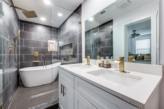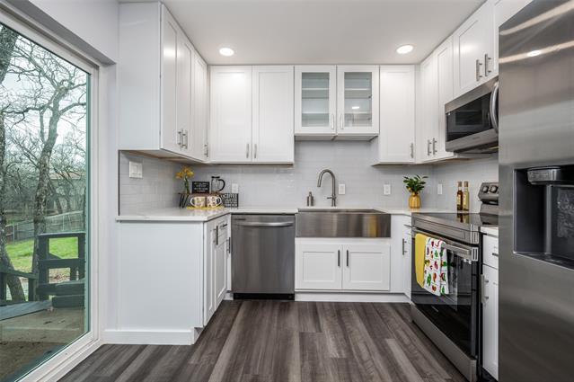 Beautifully updated 3-bedroom, 2-bath home located in the highly sought-after and rarely available Roanoke Hills community, just minutes from Lake Grapevine. The home underwent a comprehensive renovation in Spring 2024, with over $100,000 in improvements, offering modern finishes and thoughtful upgrades throughout. Major improvements completed in Spring 2024 include a new roof, gutters, windows, exterior doors, interior paint, and updated flooring throughout the home. The plumbing system was also upgraded with new PVC sewer lines, along with updated plumbing fixtures. Both bathrooms were fully remodeled in 2024 with new flooring, designer tile, vanities, mirrors, fixtures, and showers. The primary bathroom features a distinctive enclosed soaking tub with elegant gold trim and handheld spray, creating a spa-inspired retreat. The kitchen was completely redesigned in 2024, featuring stainless steel appliances, Calacatta quartz countertops, custom cabinetry with soft-close drawers and doors, and a multifunctional farmhouse sink, making it ideal for both everyday living and entertaining. Additional improvements from the 2024 renovation include an updated electrical panel and breakers, new switches and outlets, recessed lighting, modern ceiling fans, and a remodeled fireplace. All work was permitted and City approved with Green Tag certification. Enjoy outdoor living from the covered back porch overlooking a spacious, park-like backyard with mature trees. The Cross Timbers Trailhead is only about 5 minutes away, offering convenient access to hiking, trail running, equestrian riding, mountain biking, and Grapevine Lake. With close proximity to the lake and outdoor recreation, this home offers a unique combination of modern updates and natural surroundings. Excellent Airbnb or short-term rental investment opportunity. Move-in ready and a must-see.