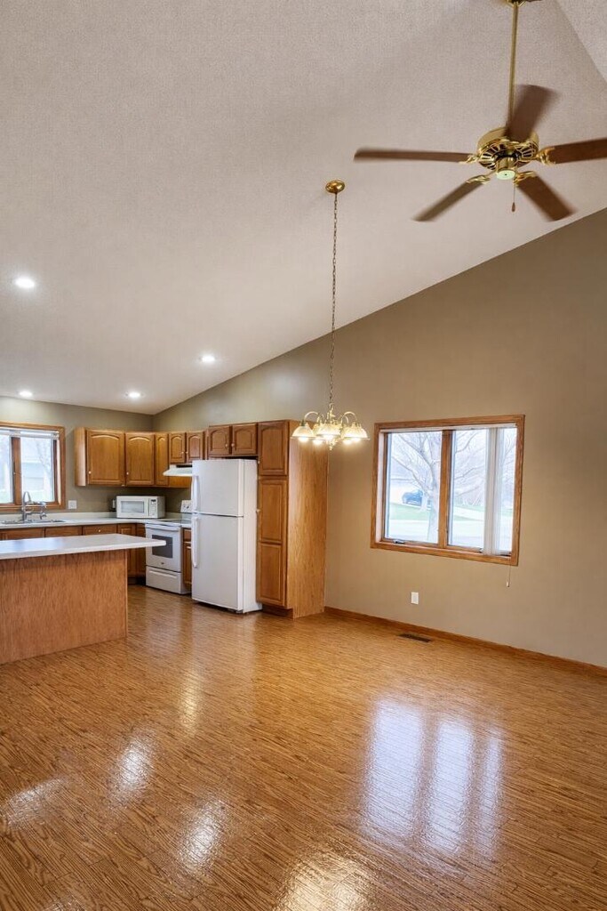 Enjoy comfortable, low-maintenance living in this well-designed 2-bedroom, 2-bath townhome offering 1,312 square feet of convenient main-level living. Located in a 55+ community, this property is ideal for those looking for ease, accessibility, and a simplified lifestyle.The home features an open floor plan with vaulted ceilings, creating a bright and spacious feel throughout the main living areas. The kitchen flows seamlessly into the dining and living space, making it perfect for everyday living or hosting guests.The primary suite includes a walk-in shower, while both bathrooms are equipped with grab bars for added accessibility and peace of mind. Main-level laundry adds to the convenience.