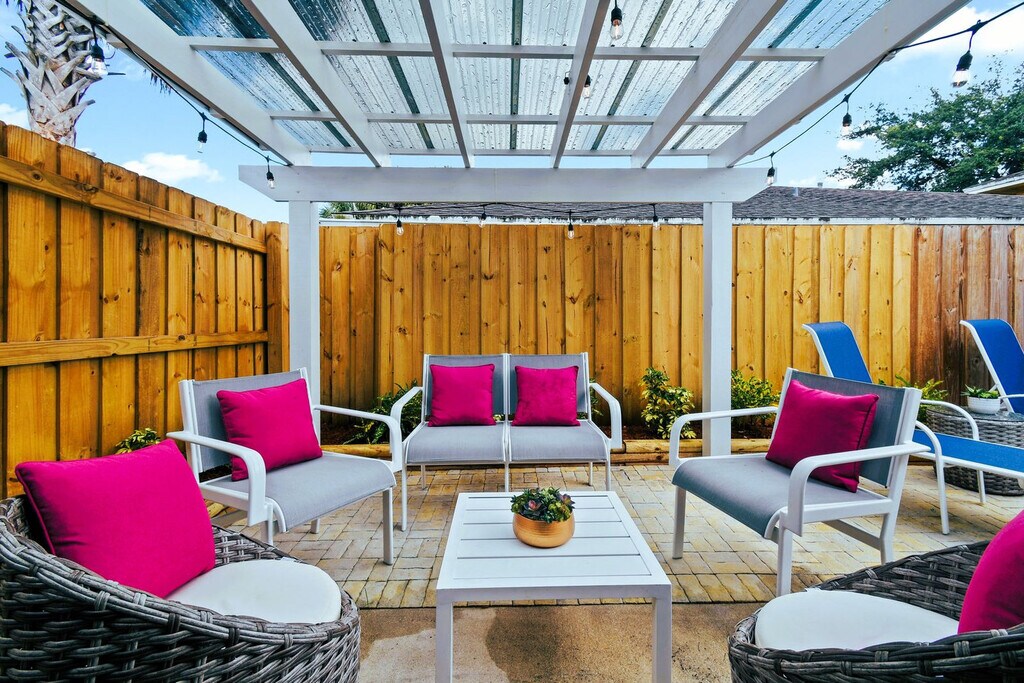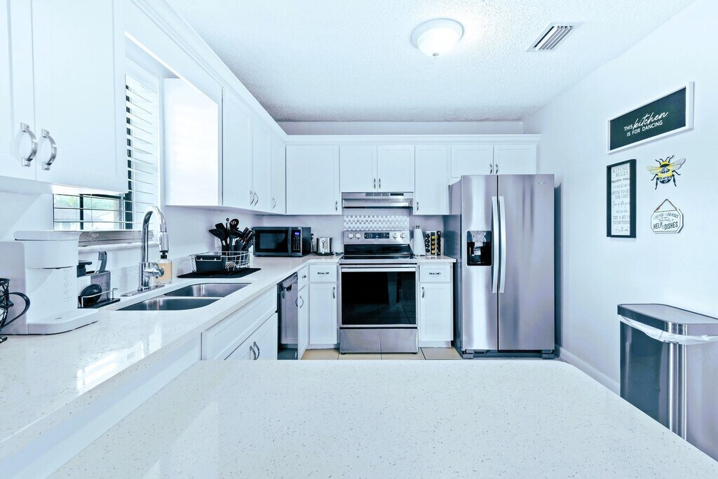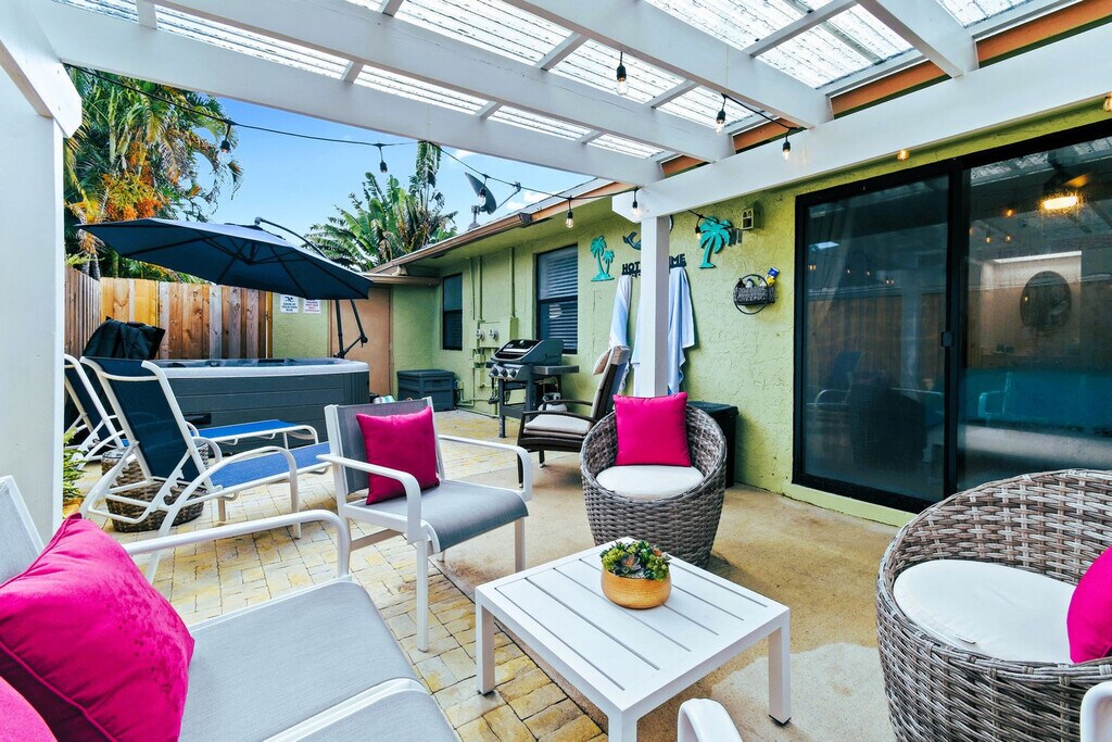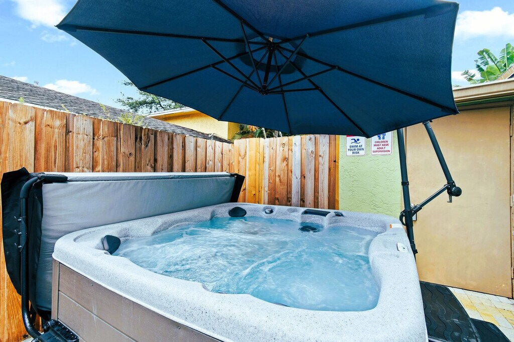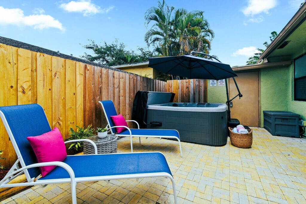 Experience our 2-bedroom, 2-bath Palm Beach Gardens retreat and feel at home. This South Florida getaway offers the perfect blend of relaxation and adventure. This recently renovated and tastefully furnished vacation home features an open-plan kitchen and living room layout designed with your enjoyment in mind. The fully stocked kitchen is complete with all the utensils, cookware, and appliances you need. The master bedroom offers the ultimate comfort with a 50” Samsung Smart TV and an en-suite bathroom. The guest bedroom with a king-size bed also features a 50” Samsung Smart TV. The second bathroom has a bathtub and shower combination. Enjoy the private backyard oasis with a 6ft fence, pergola seating, a new jacuzzi, and beach gear. Xfinity Choice TV is perfect for sports lovers. Family-friendly amenities include a cot and high chair. A laundry area with a washing machine and dryer is available. One small pet is allowed (no cats) with a non-refundable $100 pet fee. Guests are responsible for cleaning up after their pets. The property offers a gas grill for your enjoyment, perfect for outdoor cooking. Guests are responsible for cleaning the grill after each use and before check-out. A maximum of three cars are allowed to park in the driveway. Centrally located in Palm Beach Gardens, this house is a 15-minute drive to Juno Beach and Ocean Reef Park beach, a 10-minute drive to the PGA National Golf resort and 15-20 minutes drive to numerous other golf courses, 5 minutes from the Garden’s Mall, 15 minutes from City Place and Palm Beach Outlets, and 15 minutes from Palm Beach International Airport. A selection of gourmet restaurants are all in Palm Beach Gardens, a 5-10 minute drive from the house. Quiet hours are 10pm – 8am every day. Use of the hot tub is at your own risk, and children in the hot tub must be supervised by an adult at all times. If the grill or kitchen oven is not cleaned to a satisfactory standard, a cleaning fee of $150 will be charged. No more than 6 people are allowed to stay overnight at the property. A photo copy of the lead guests drivers license which matches the credit card used to book is required upon booking, and the lead guest must be 27 years or older to book. The kitchen features a convenient breakfast bar that doubles as a remote work area. High-speed internet is available, allowing you to seamlessly stay connected. Registration Number: 000026301, [SI]