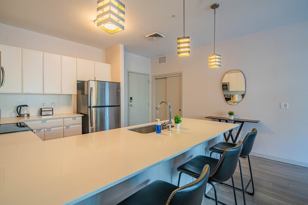 Live that lovely Phoenix life and feel at home in this comfortable, modern apartment in a quiet neighborhood. This 2-bedroom unit offers a clean, classy, and trendy space. The living space features an innovative open-concept design that blends the living and dining areas with the kitchen, creating a modern and sleek living experience. The living room includes a sofa bed, chair, 4K 55" HDR smart TV, and coffee table. The fully equipped kitchen features a microwave, stove, oven, refrigerator/freezer, dishwasher, toaster, coffee maker with coffee essentials, electric kettle, sink with hot and cold water, glasses, silverware, pots, pans, and a dining table with chairs. Bedroom 1 features a queen-size bed with pillows, linens, and sheets, a 4K 43" HDR smart TV, an office desk and chair, and reading lamps. Bedroom 2 features two full-size beds with pillows, linens, and sheets, a 4K 43" HDR smart TV, and reading lamps. The inviting full bathroom is completely private and separated from the main room and is stocked with essential toiletries, including a bath with a shower, wash basin, mirror, toilet, towels, hand towels, washcloths. Parking is available with one spot. A parking pass must be printed out. An additional cleaning fee of $20 per night is required for pets. Strategically placed, you have access to places of interest, including pubs, bars, good food places, and businesses. The apartment is located in the vibrant district of Phoenix, a dynamic urban enclave that combines modern living with cultural richness. Immerse yourself in the arts and culture scene at the Roosevelt Row Arts District, known for its eclectic galleries and vibrant street art. Indulge in the diverse culinary landscape of downtown Phoenix and experience the lively nightlife with trendy bars and rooftop lounges. Chase Field and Talking Stick Resort Arena are within easy reach. Enjoy the outdoors at nearby Hance Park. Navigating the city is a breeze with convenient access to public transportation and major highways. The Roosevelt/Central Ave Station is nearby, providing easy access to key destinations in Phoenix via the light rail. Phoenix boasts a bike-friendly atmosphere, and the apartment is situated in an area where cycling is both practical and enjoyable. Rideshare services such as Uber and Lyft are readily available in downtown Phoenix. The apartment is ideally situated within walking distance of various attractions, dining options, entertainment venues, and cultural hotspots. Easy access to major highways like I-10 ensures quick and efficient travel. Quiet hours are between 10 pm and 8 am every day. Noise complaints or any violation of this rule may result in cancellation of booking and removal from the property without refund. There is a strict no-party policy. If there is a party of any kind, the police will be called and everyone will be removed from the property with no refunds. No unauthorized guests are allowed at the unit; the fine is $100 per guest if discovered. Smoking is prohibited without exception on this property. If any signs of smoking are found in the unit or on the premises, a fine of $500 will be imposed. If you are found to have brought pets without prior notification, there will be a $500 fee. If the noise monitors are tampered with, there will be a fee. You may be charged extra for cleaning if the property is left in a state that necessitates additional cleaning. Lost or unreturned keys cost $80 for key replacements and $150 for key fob replacements. For delayed checkout, there will be a $500 late checkout fee. [SI]