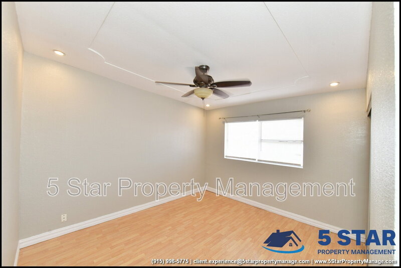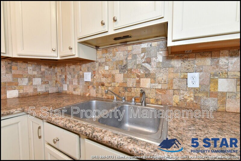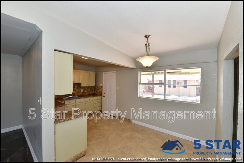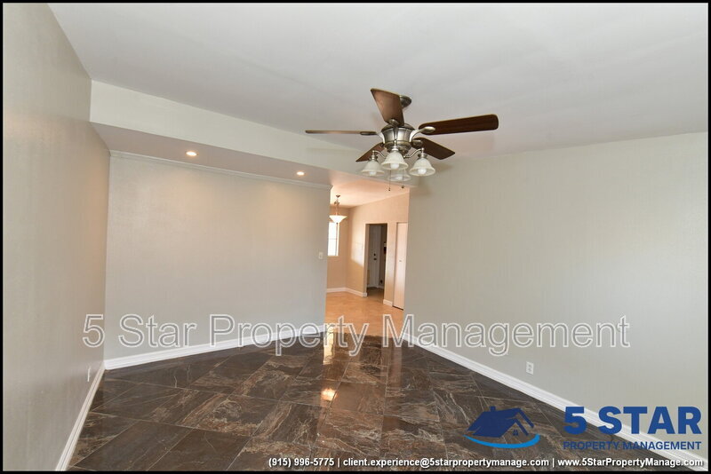 Clean lines and durable finishes shape a home designed for straightforward living with enduring style. A covered carport and stone-trimmed exterior set a welcoming tone while providing functional shelter. Inside, glossy tile floors span the main living spaces, reflecting daylight from wide windows and creating a bright, open atmosphere. The living area connects seamlessly to the dining space, where a modern light fixture anchors gatherings without overpowering the room. The kitchen delivers practical efficiency through generous cabinet storage, tiled backsplash details, and resilient counters suited for daily routines. Three bedrooms are thoughtfully arranged off the main hall, each offering ceiling fans and wood-style flooring that balances comfort with easy care. The bathroom stands out with full tile finishes, a contemporary vanity, and a walk-in shower configuration that feels purposeful and refreshed. Outdoors, the fenced backyard emphasizes low-maintenance living with gravel landscaping, patio pads, and a detached storage shed for added convenience. Situated in El Paso, the location supports quick access to Franklin Mountains State Park, Scenic Drive Overlook, and established commercial corridors. Deposit-Free Renting service to Obligo qualified renters, fees may apply. For Showings information and availability, please call at By: 5 Star Property Management | EL PASO Texas Rentals | EL PASO Property Management | Property Management in EL PASO *Important: Information is deemed reliable but not guaranteed. All information is submitted subject to errors, omissions, change of price before the lease, or withdrawal without notice.