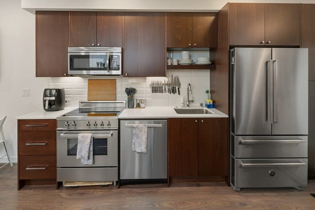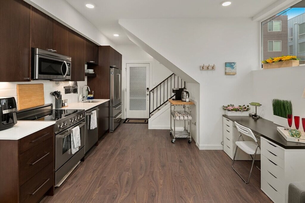 Feel at home in this modern townhome, centrally located near restaurants, shops, transit, schools, and hospitals in Seattle. With a high walk score of 96, this 4-story townhome, including a rooftop, offers 2 bedrooms and 2 bathrooms across 1058 sqft. Access the home via a staircase walkway, and enjoy the convenience of dedicated parking. This city center townhome features a well-designed floor plan with bedrooms and bathrooms on different levels, perfect for group travel. The first floor includes a living room with a queen sofa sleeper, a fully equipped kitchen, and dining area, with access to a side yard with a BBQ grill. The second floor hosts a bedroom with a queen bed and a hallway bath with a bathtub and shower combo. The primary bedroom on the third floor includes a queen bed, a Smart TV, and an ensuite bathroom with a shower. Enjoy the rooftop patio with outdoor seating for an al fresco experience. The home is air-conditioned and offers an extra desk in the living room for remote work, along with high-speed internet and a Smart TV for entertainment. The townhome offers parking for two cars with dedicated parking and one extra parking permit for free street parking. Well-trained pets are welcome with a fee of $50 per night. Additional guest fees are $25 per person per night for more than four guests, up to a maximum of six guests. Nestled between downtown and the vibrant Capitol Hill neighborhood, this townhome in First Hill / Cherry Hill offers a unique Seattle experience. With lush tree-lined lanes, the iconic St. James Cathedral, and quirky local finds, you'll be positioned to make the most of the entire city. Enjoy easy access to Amazon, UW, Pike Place Market, and medical centers. The area boasts a high walk score with many dining, shopping, and entertainment options within walking distance, and bus stops are less than a 5-minute walk away. Ride-share services are highly recommended for getting around. This townhome is not handicap-friendly and requires comfort with stairs due to its multiple stories. Guest access is granted via a smart lock. The home strictly prohibits parties and events, with quiet hours between 10pm and 8am, and no smoking or vaping of any kind on the property. A $500 fine applies per violation. Pets are not allowed on furniture or linens, and guests should bring poop bags and pick up after their pets. Includes an extra desk in the living room for remote work, high-speed internet, and a Smart TV for streaming or work needs. A laptop computer is not included. Registration Number: STR-OPLI-21-001313