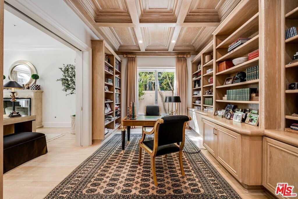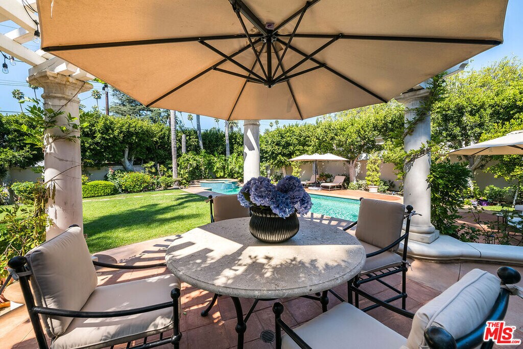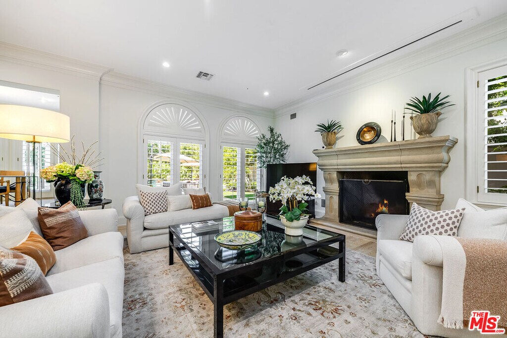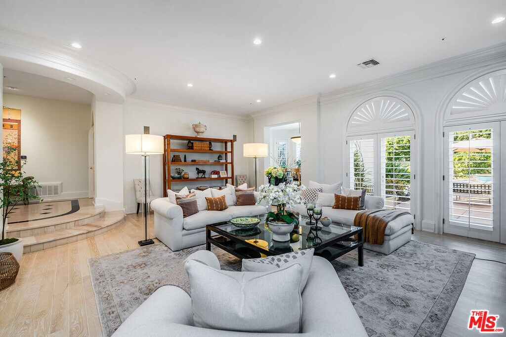 Behind double front gates in prime Beverly Hills just North of Sunset Boulevard, this grand Contemporary Villa, built in 1991 by renowned builder Martin Selko and designed by Sheri Schlesinger, showcases exquisite curb appeal and timeless elegance. A sweeping motor court, two-car garage, and lush landscaping set the stage for the estate's impressive presence. The residence opens to a dramatic two-story foyer with intricate marble floors, skylight, and a sweeping staircase. Sunlit rooms with soaring ceilings, fine moldings, and French doors create a bright, inviting atmosphere throughout. The formal living room with fireplace and a handsome library/office with custom paneling provide refined spaces for entertaining and work. Wide hallways and generous wall space are ideal for art display. At the heart of the home lies the expansive gourmet kitchen, featuring a large eat-in island, professional-grade appliances, and a cheerful breakfast room. The kitchen flows into the spacious family room with fireplace and built-in bar. The outdoor oasis offers a dining gazebo, pool, spa, patios, and manicured lawn, perfect for entertaining or relaxing in privacy. Upstairs, a skylit landing opens to a secondary family room. Three guest or family bedroom suites, each with en-suite baths, accompany the luxurious primary suite with fireplace, dual marble bathrooms, two room-sized walk-in closets, and a private balcony overlooking the grounds. A staff/maid's suite is conveniently located on the main level. The estate is offered furnished with exquisite pieces by J. Robert Scott, enhancing its sophisticated interiors with refined style and comfort. This exceptional lease combines elegance, comfort, and distinguished design with a premier Beverly Hills location, moments from world-class shopping, dining, and entertainment. MLS# 25607171