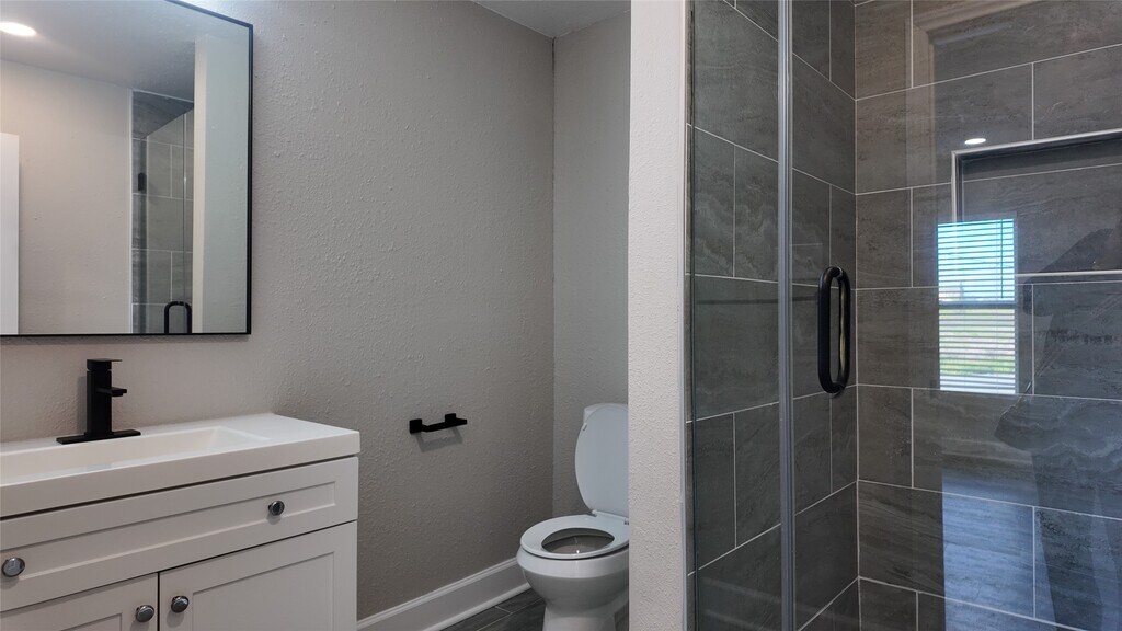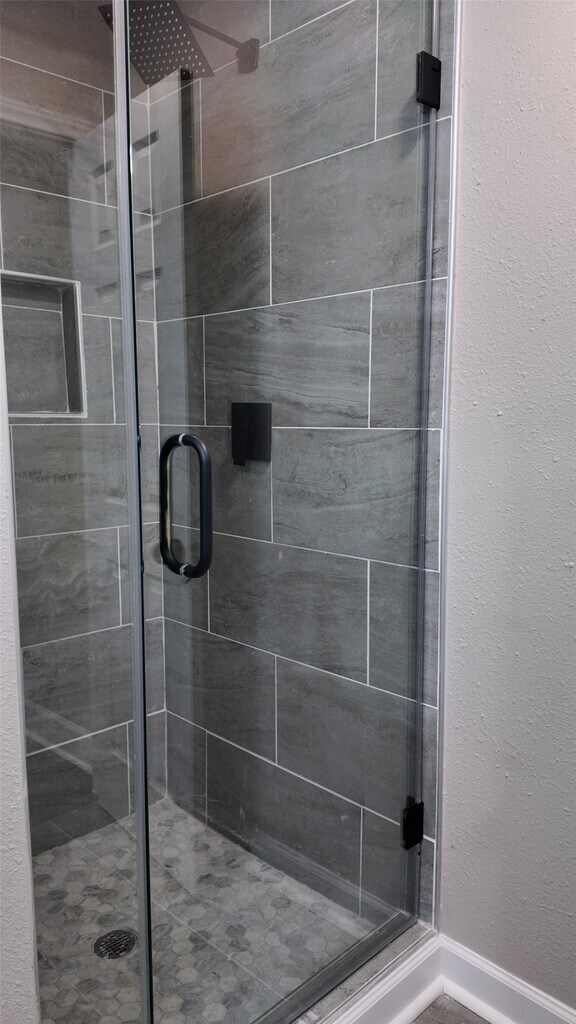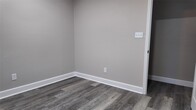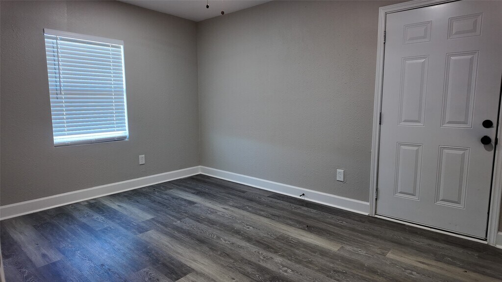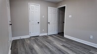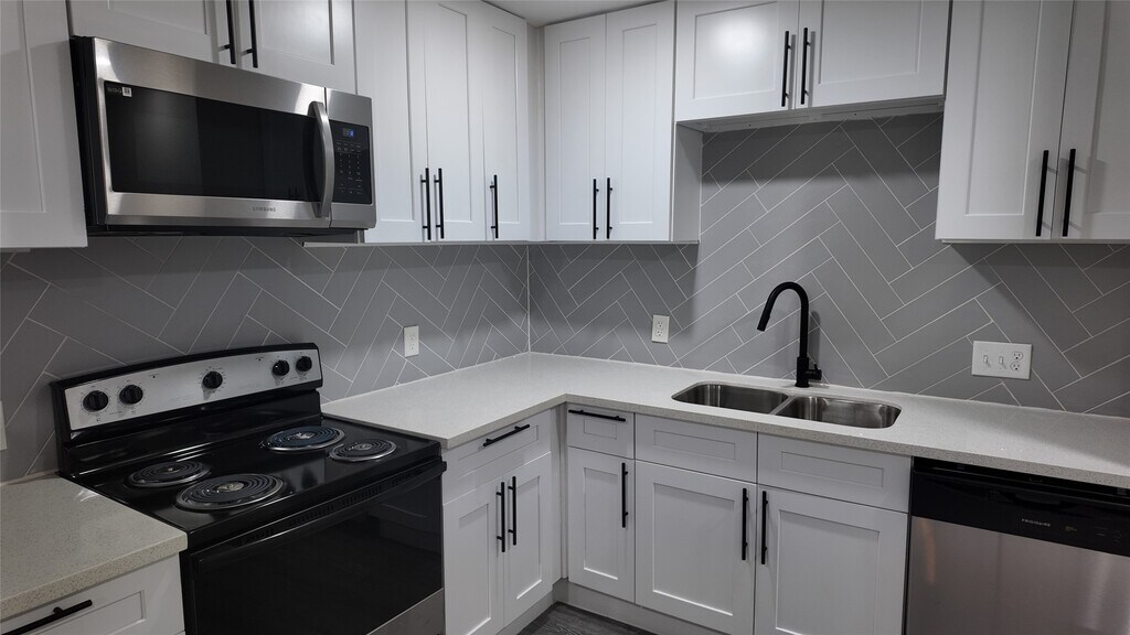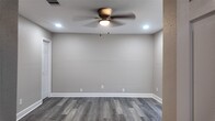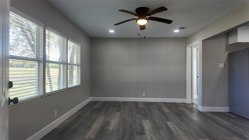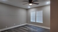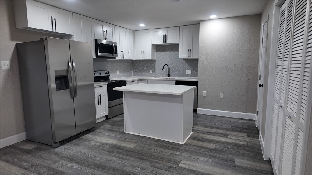 A fully updated single-story home featuring an open layout,modern finishes,and consistent flooring throughout. The living area includes recessed lighting,ceiling fan,and large windows for natural light. The kitchen offers white shaker cabinets,black hardware,stainless steel appliances,herringbone tile backsplash,and a center island. The bedrooms include matching flooring,ceiling fans,and neutral paint. The bathrooms feature updated tile,modern vanities,and black fixtures,including a glass-enclosed shower in the primary bath. The laundry closet includes washer and dryer. The exterior of the home features a covered front porch,concrete drive,fenced backyard,and mature trees. MLS ID 96488155