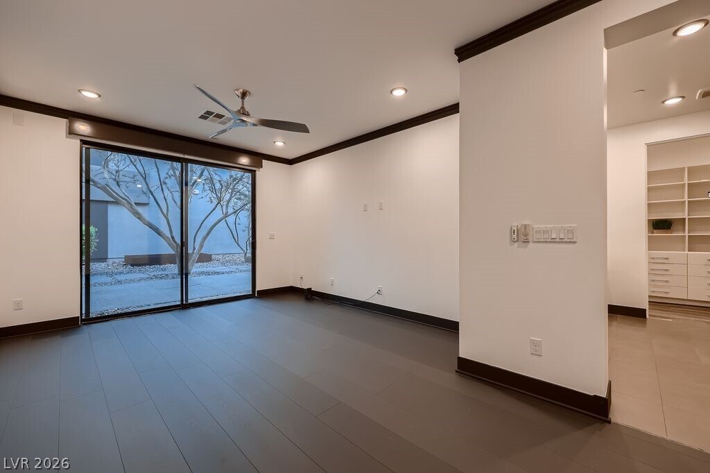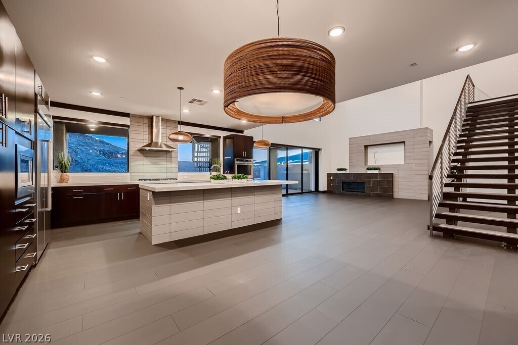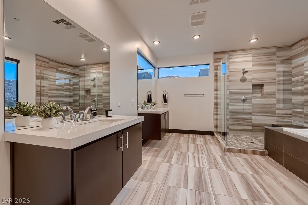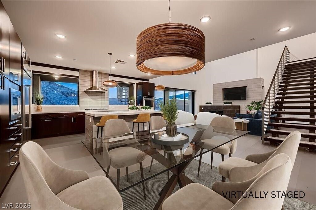 Now available for lease at Sky Terrace, this striking modern home by Blue Heron offers elevated desert living with stunning rooftop views of the Las Vegas Strip. The light-filled open floor plan features a spacious great room, gourmet kitchen, and sleek wine bar—perfect for entertaining. Enjoy seamless indoor-outdoor living with a tranquil courtyard and resort-style pool. The home includes three ensuite bedrooms with spa-inspired baths and custom closets, including a convenient main-level suite, plus a flexible fourth bedroom near a full bath. Recently remodeled with over $60,000 in upgrades, including new lower-level flooring, elegant black crown molding and baseboards, modern black recessed lighting, fresh interior paint, a newly coated roof, and upgraded pool tile with completed repairs. Sophisticated design, premium upgrades, and prime location—ready for immediate occupancy.