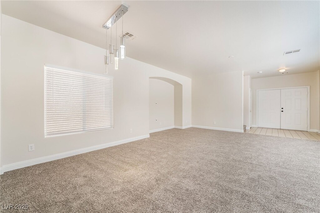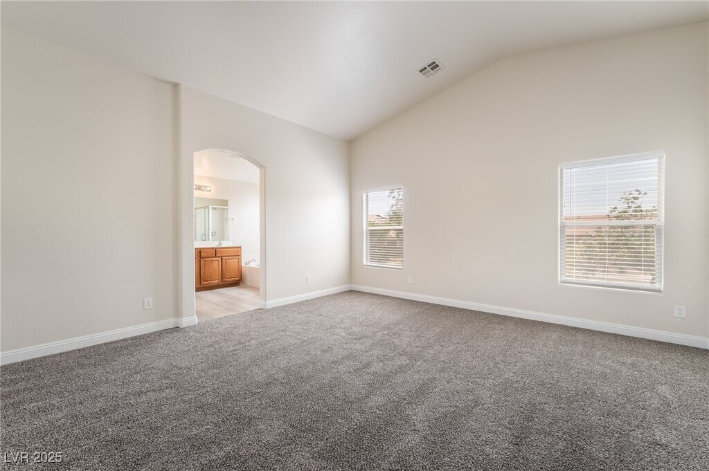 Beautiful home in the gated Arlington Ranch community of Mountains Edge. This 3-bedroom home features a bright and open floor plan with brand new carpet, paint and a long driveway leading to a double-door entry. The spacious kitchen boasts custom cabinets, hard surface countertops, a beautiful backsplash, and all appliances included. Enjoy the large great room filled with natural light, ceiling fans, and window blinds throughout. The generous upstairs loft is perfect for a game room or second living area. The expansive primary suite offers vaulted ceilings, a huge walk-in closet, double sinks, and a main bath with a separate tub and shower. The laundry room includes a convenient wash sink. Low-maintenance desert landscaping with brand new artificial turf. Located near to schools, parks, walking trails, and shopping
