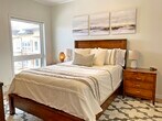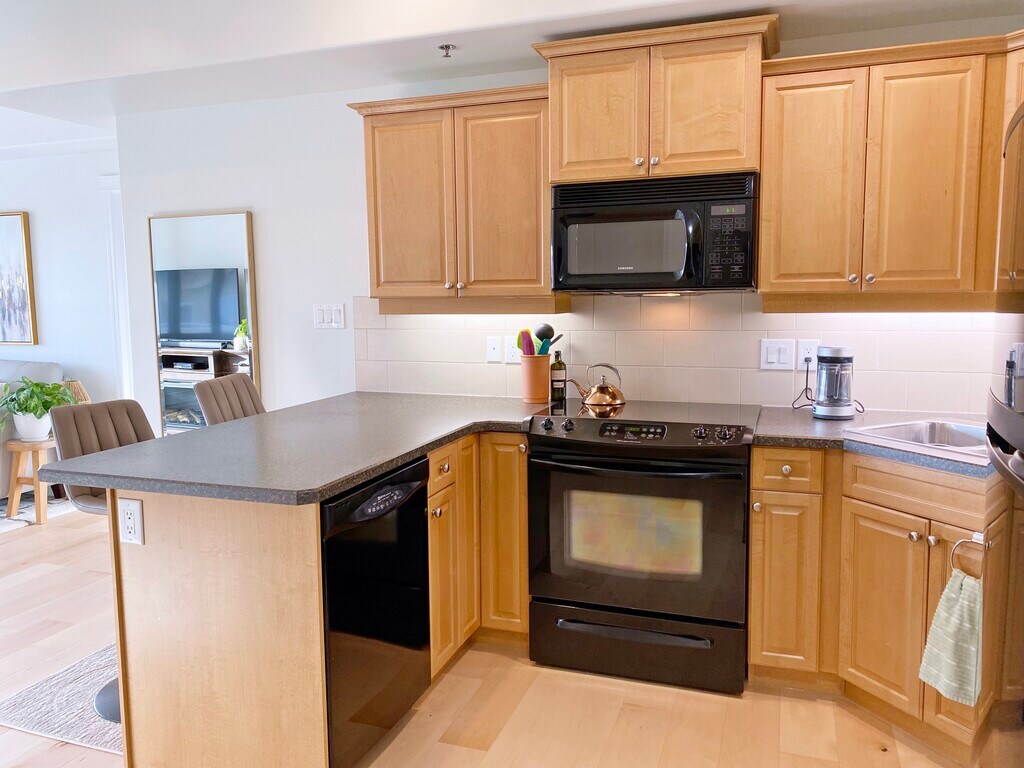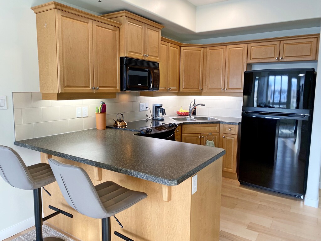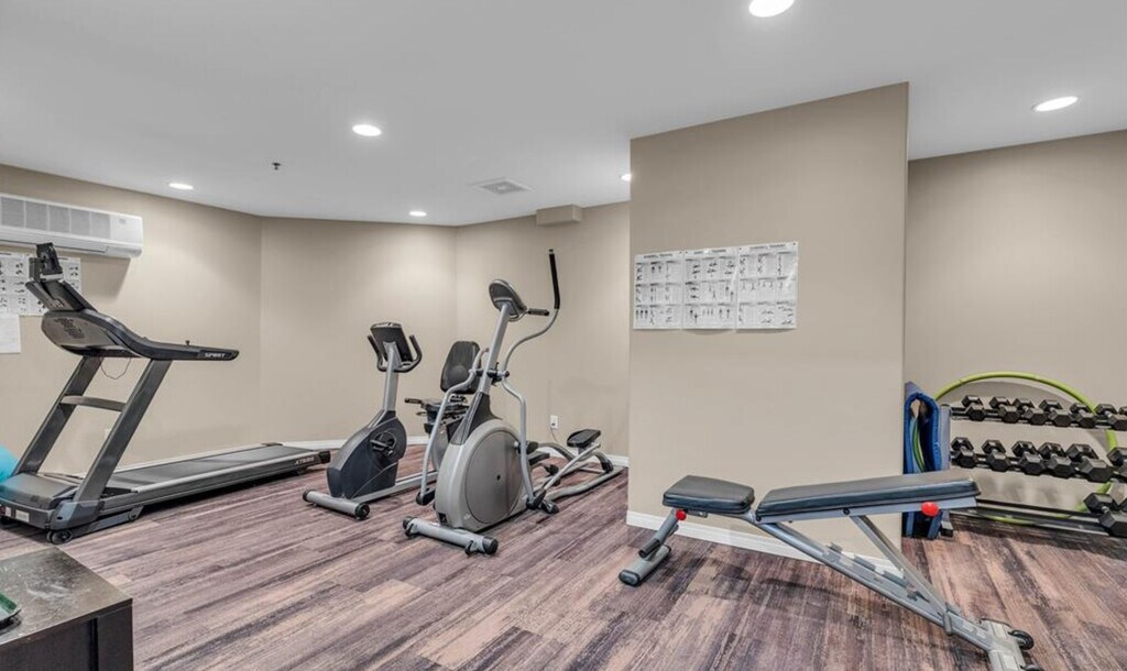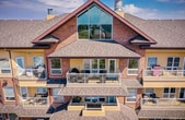 This top floor condo features 2 bedrooms and 1 bathroom. The living room includes a fireplace and opens to a balcony, providing outdoor space. The kitchen is equipped with a dishwasher and includes a washer and dryer for convenience. The building offers amenities such as an elevator, fitness center, and smoke-free environment. Additional storage space is available for residents. The property is furnished, making it move-in ready. The exterior includes a courtyard for relaxation and outdoor activities. The rental rate reflects long term price. Power and wifi extra.