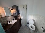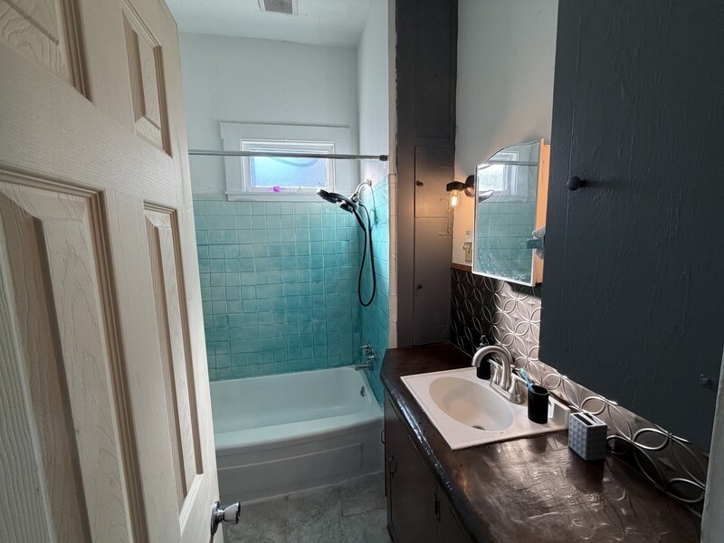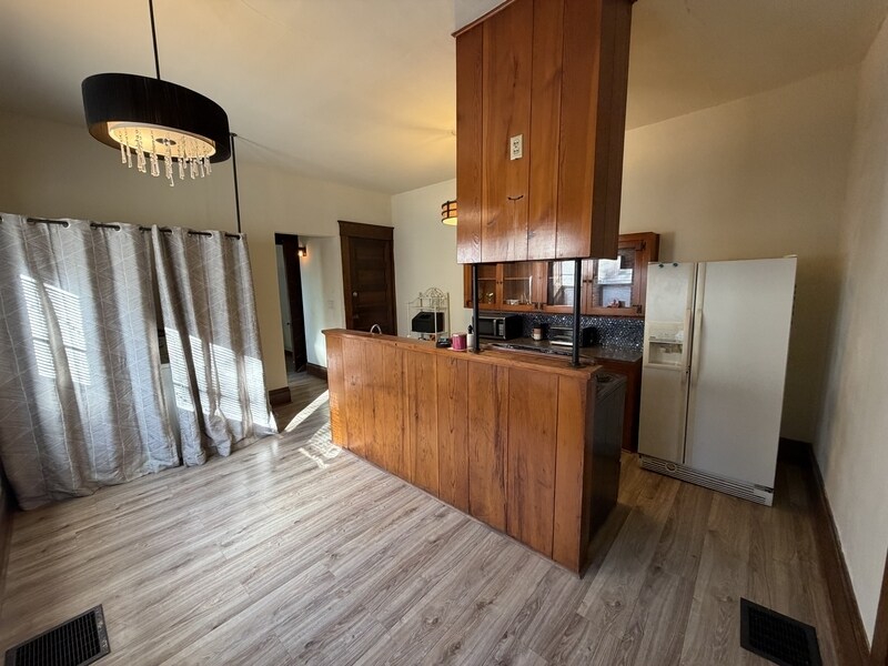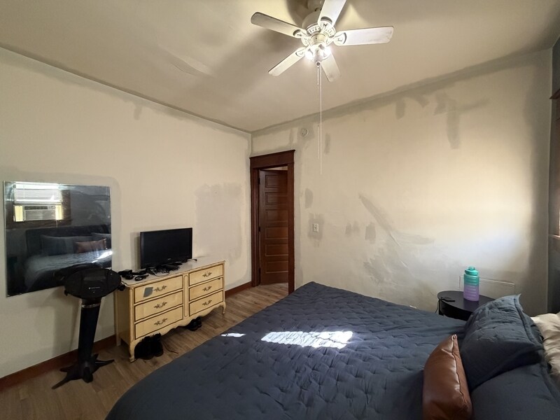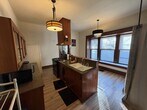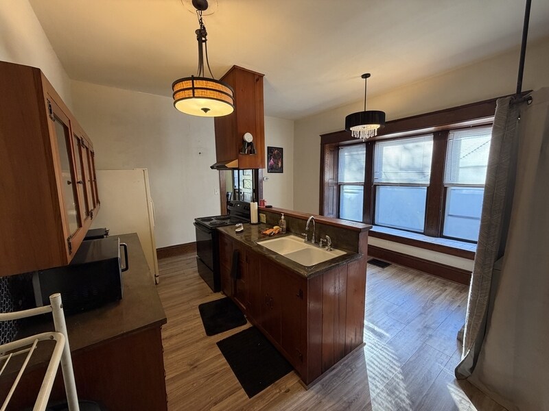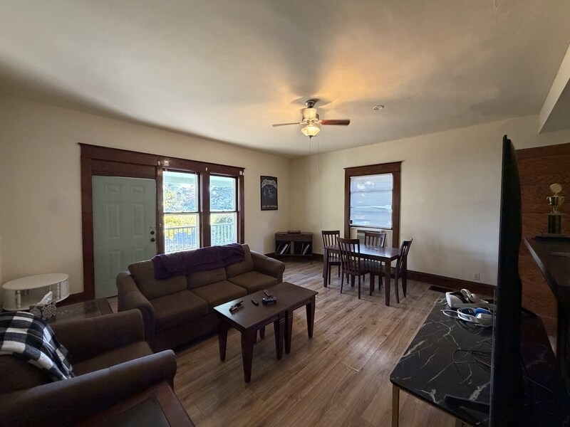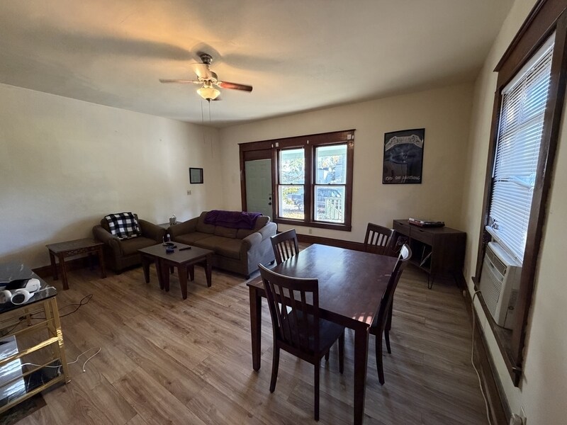This spacious one-bedroom, one-bath apartment is located just minutes from downtown Columbus, offering convenient access to city amenities while maintaining a quiet, residential atmosphere. Inside, the apartment features a generously sized bedroom with two windows for natural light, ample closet space, and an adjacent full bathroom with a tub/shower combo and updated lighting. The main living area is open and bright, with a dedicated dining space and a large front window allowing for ample natural lighting. The kitchen offers plenty of counter space and classic wood cabinetry. A washer and dryer hookup is located just off the kitchen for easy access. The unit includes updated flooring throughout, ceiling fans, and original wood trim that adds warmth to the home. Flat-rate utilities are $180/month, covering water, sewer, electricity, gas, and trash service, and are paid conveniently through the tenant portal. This is a pet-free and smoke-free property.