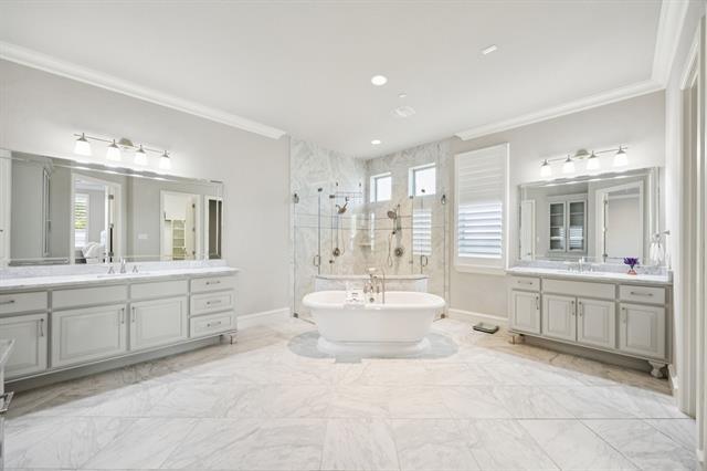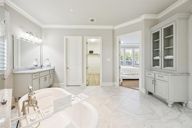 Stunning FULLY MODERN FURNISHED Home in Carillon, Southlake’s premier master-planned community, known for its picturesque lakes and resort-style amenities. Ideally located near top-rated schools, dining, and shopping. This designer-inspired 5 bedroom, 5 bathroom residence with 2 powder rooms offers refined living on an oversized corner lot. Every bedroom features its own ensuite bath, ensuring privacy and comfort throughout. The home is filled with natural light, enhanced by wood floors and thoughtful designer touches at every turn. The open layout includes a gas fireplace in the living room, a dedicated office, elegant formal dining with soaring double-height ceilings, and a breakfast area off the kitchen. Upstairs, the game room with bar area and media room provide ideal spaces for entertaining and relaxation. The expansive primary suite is a true retreat with wall-to-wall windows and shutters, a spa-like bathroom, and two oversized walk-in closets. For seamless indoor-outdoor living, sliding doors disappear into the wall, opening to a generous covered patio. A split garage adds both convenience and functionality. Carillon offers a resort-style lifestyle with three lakes, a sparkling pool with pavilion, sport courts, picnic areas, playground, and miles of scenic trails.