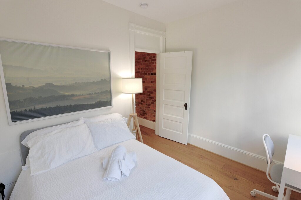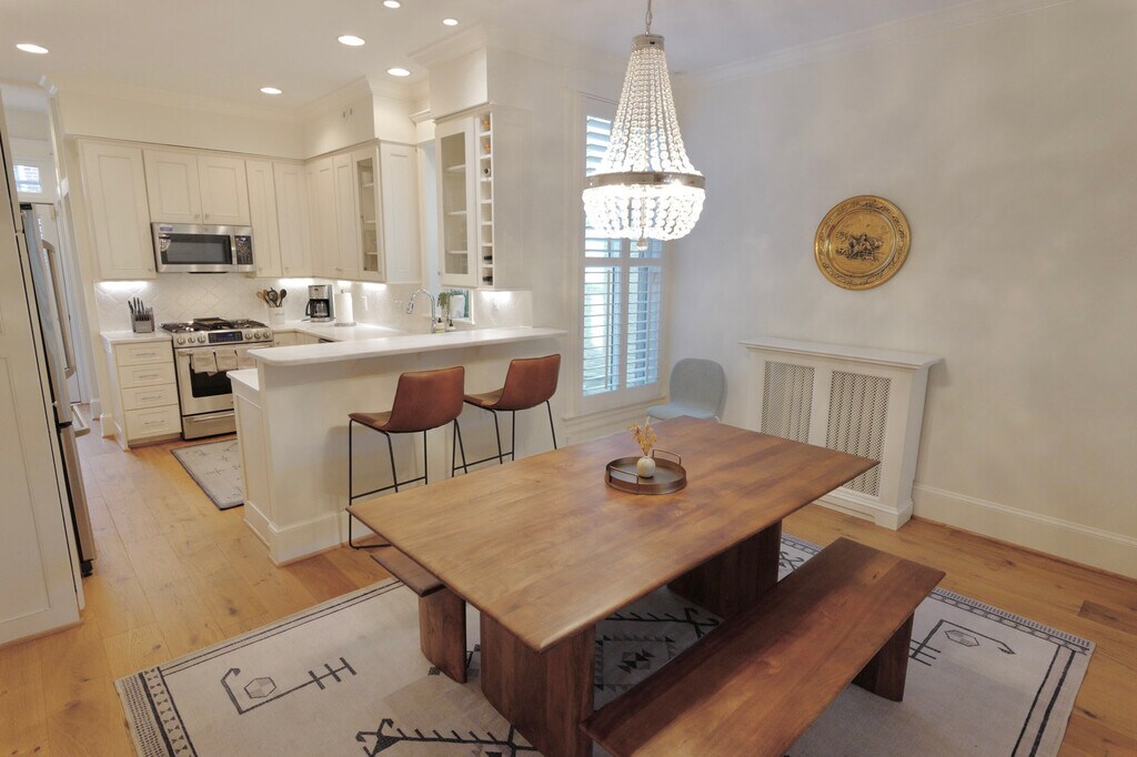 Nestled in the heart of the vibrant Eastern Market neighborhood, this fully furnished 3-bedroom, 1.5-bathroom Capitol Hill home offers a harmonious blend of timeless charm and modern convenience. Boasting a flowing floor plan, the main level features an elegant living room with a bay window and a cozy fireplace, seamlessly transitioning to the open dining area and gourmet kitchen with a breakfast bar, perfect for both entertaining and everyday living. The large primary bedroom is a true retreat, offering a bay window, cathedral ceilings, and custom closets, creating a serene and spacious atmosphere. An exposed brick hallway with the original skylight leads to the middle bedroom and a rear bedroom or office, all served by a beautifully appointed full bath. Just steps away from the new community park, Metro, Trader Joe’s, Eastern Market, and Barracks Row, this home offers unparalleled convenience and access to all the best the neighborhood has to offer. [SI]