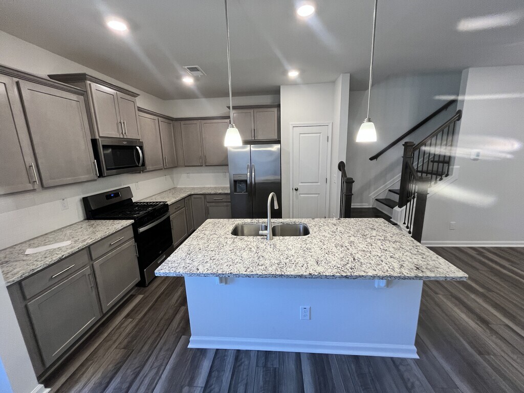 Luxurious, dog-Friendly, 1-car garage townhome in a fantastic location ready for you to call home today! Enter through your wide foyer to your open-concept first floor. Half bath and garage greet you as you walk in. The spacious living area with tall ceilings and hardwood floors throughout continues to the dining space and backyard, backing up to serene landscaping. The kitchen boasts SS Appliances (incl GAS Range), tall cabinets with granite countertops, pantry for storage, and large island with sink and counter overhang to eat and entertain. Primary bedroom upstairs has wall of windows, very large walk-in closet and gorgeous en-suite bathroom with double vanity and a tiled shower. Upstairs is rounded out by 2 additional bedrooms and a hallway bath with tub, as well as laundry room. Dog-friendly (limit 1 dog) w/ non-refundable Pet Fee of $350 (per pet) and $30 Pet Rent (per month, per pet). Renters Insurance Req'd - $200K minimum. Application speed and preference given to Zillow Applications. Otherwise Application Fee of $100/applicant (contact Manager). Resident Qualification Criteria are available upon request. Overview of criteria: 1) 650+ credit score for one applicant; lower credit scores will be considered on a case-by-case basis and may require a co-signor/guarantor w/ 650+ and/or 2.0x SD 2) Household monthly income of 3x rent rate ($5,700/m or $68,400/yr) 3) No evictions, foreclosures, bankruptcy, or criminal felonies or misdemeanors in last five (5) years. 12-month lease at marketed rent rate. Tenant responsible for electricity, gas, water/sewer, and trash/recycle. HOA/Owner responsible for lawn maintenance and INCLUDED in rent. Dog-friendly (max 1 dog) with $350 non-refundable Pet Fee (per pet) and $30 Pet Rent (per pet, per month). Driveway and 1-car Garage Paring. Absolutely no smoking/vaping inside the house. Renters Insurance Req'd - $200K.