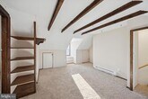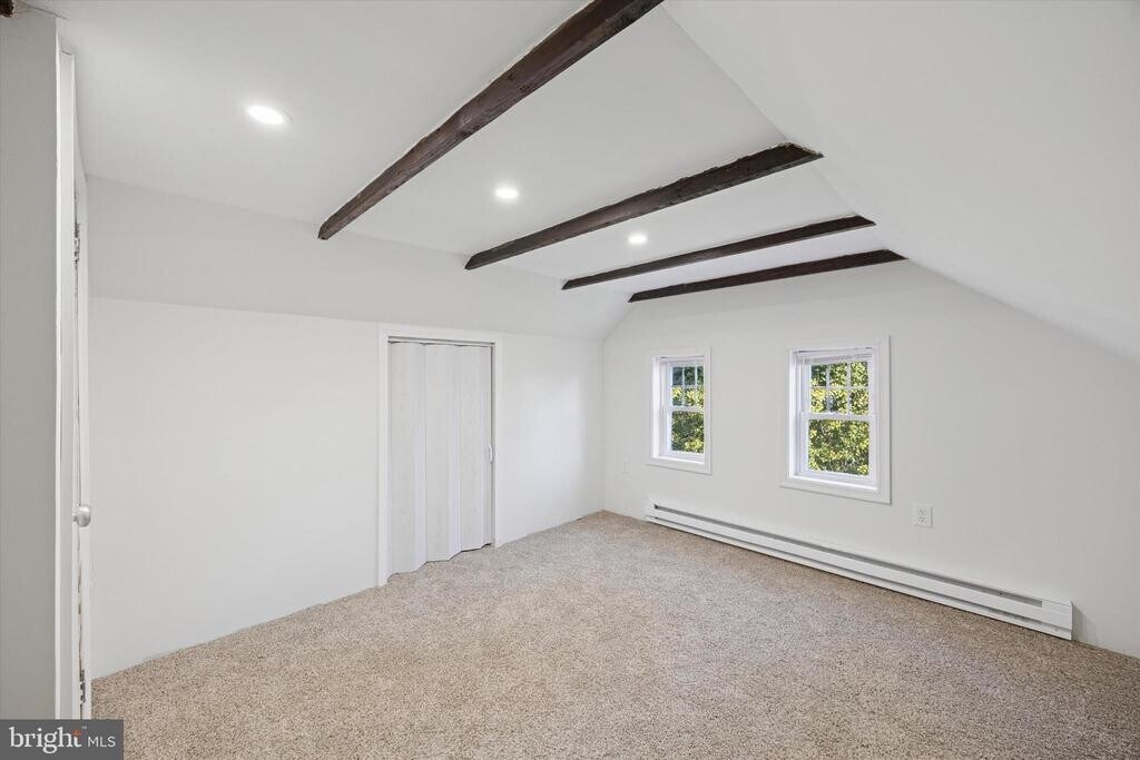 This charming 1830 farmhouse offers over 2,000 square feet of living space across the second and third floors of a duplex. The main living level includes a formal living room, family room, kitchen, and a primary bedroom, with hardwood floors and exposed beams throughout. Upstairs are four additional bedrooms with ample closet space, providing flexibility for a variety of living needs. The property also features plenty of parking and classic farmhouse character throughout.