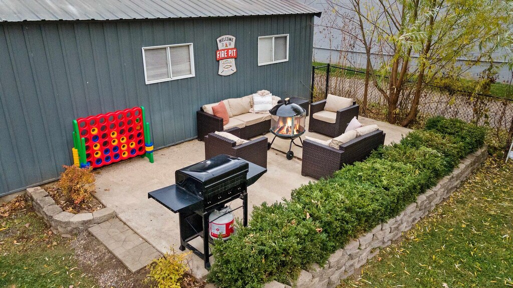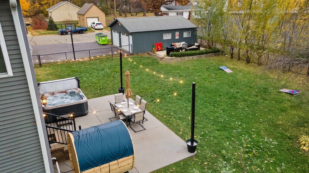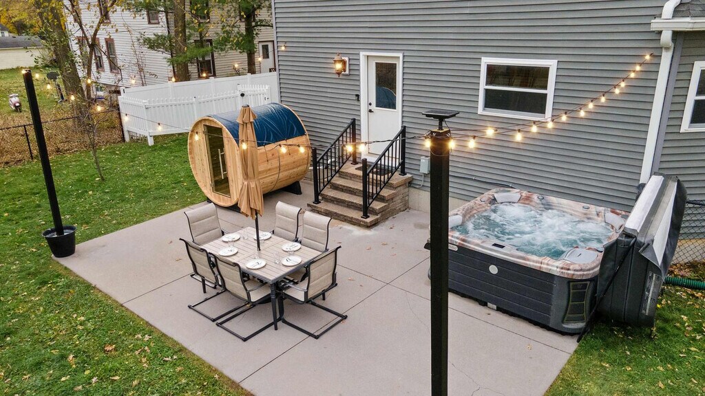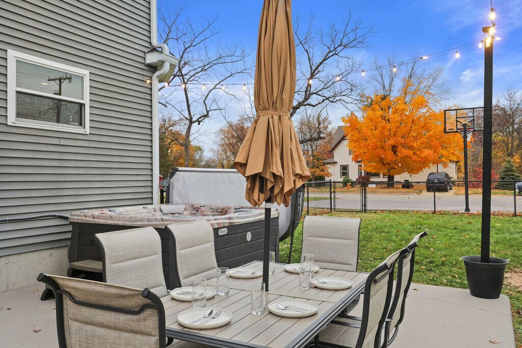 Feel at home in this spacious home that sleeps 18, perfect for families and groups. The side entrance off the driveway has three steps leading to the home. This home features a fenced-in backyard with a hot tub, sauna, and fire pit, as well as outdoor living spaces with lounge seating, a dining table, and a rocker swing. Inside, enjoy a game room with a pool table, PacMan, NFL Blitz, and a 55" smart TV, plus a casino room with a poker table, ping pong, and lounge chairs. The main level includes a queen bedroom, a half bathroom, a kitchen, a dining area, and a living room, with direct access to the backyard. The second level has three bedrooms, two full bathrooms, laundry facilities, and a reading nook. The third-story loft is a casino-themed game room, and the finished basement offers a large sectional couch, a pool table, and a 65" smart TV. The fully stocked kitchen features a large island, barstool seating, granite countertops, stainless steel appliances, a kids' high chair, and children's dinnerware. A washer and dryer are available for your convenience, and detergent is complimentary. Located in a walkable and quiet neighborhood just three blocks from Broadway Street and a two-minute walk to Bowman Park, this home is close to many attractions. It's a short drive to Asgard Underworld Arcade (3 min), Big Sky Twin Drive-In Theater (5 min), Bowman Park (1 min), Canyon Creek Riding Stables (12 min), Cascade Mountain (25 min), Christmas Mountain Village (12 min), Crystal Grand Music Theatre (10 min), Dells Army Ducks (7 min), Devil’s Lake State Park (26 min), Devil's Head Resort (35 min), Broadway Street (1 min), H.H. Bennett Studio & Museum (2 min), Justagame Fieldhouse (3 min), Kalahari Waterpark (13 min), Kwik Trip (1 min), Mirror Lake State Park (14 min), Mt. Olympus Water & Theme Park (5 min), Noah’s Ark Waterpark (7 min), Outlets at the Dells (Tanger Outlet Mall) (13 min), Palace Theater in the Dells (9 min), Pirates Cove Adventure Golf (4 min), Ripley’s Believe It or Not! Wisconsin Dells (3 min), Riverwalk Wisconsin Dells (2 min), Rocky Arbor State Park (6 min), Timbavati Wildlife Park (5 min), Tommy Bartlett Exploratory (8 min), Top Secret Upside-Down White House (6 min), Trappers Turn Golf Club (5 min), Wilderness Resort (10 min), Wisconsin Dells Antique Mall (10 min), Wisconsin Deer Park (5 min), and Wizard Quest (1 min). Quiet hours are from 10 PM to 7 AM, and guests are expected to be respectful of the neighborhood during these hours. Two pets maximum are allowed per stay, and a pet fee will apply. The basement is not temperature controlled and may be colder or warmer than the rest of the house; it is recommended to keep the basement door open to allow airflow. A baseboard heater and fan are available for use in the basement. Before arrival, guests are required to complete a quick guest verification through a trusted third-party provider. Includes a dedicated workspace in the kitchen area. [SI]