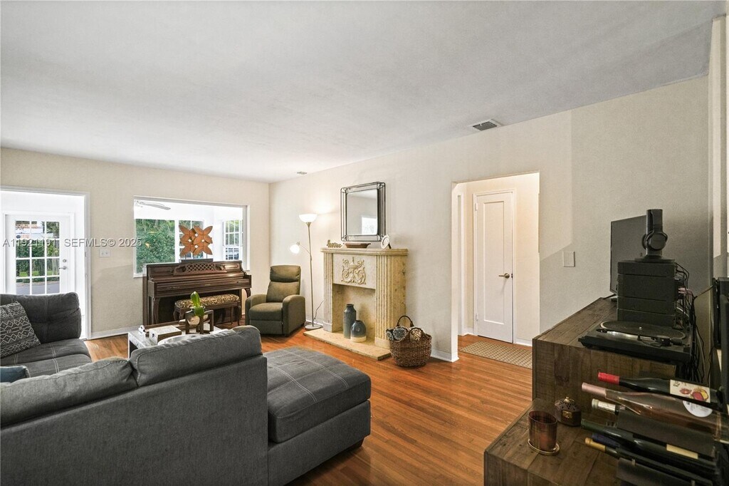 Nestled on one of North Gables’ quietest streets, this classic 2-bedroom, 1-bath home captures timeless Coral Gables charm. Overlooking Lisbon Park, it sits on a 6,773 sq. ft. lot surrounded by mature trees and natural light, offering rare privacy in this coveted area. A fully paved driveway enhances its curb appeal, while the bright sunroom opens to a warm living space with original pine floors and a cozy fireplace.