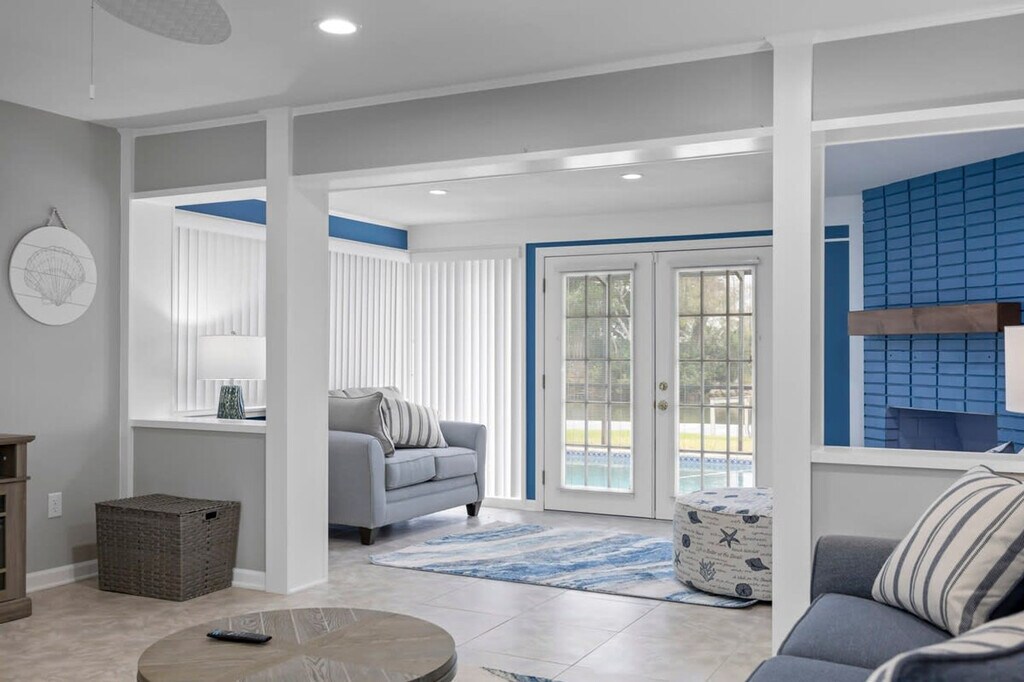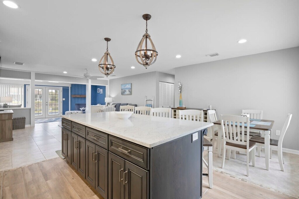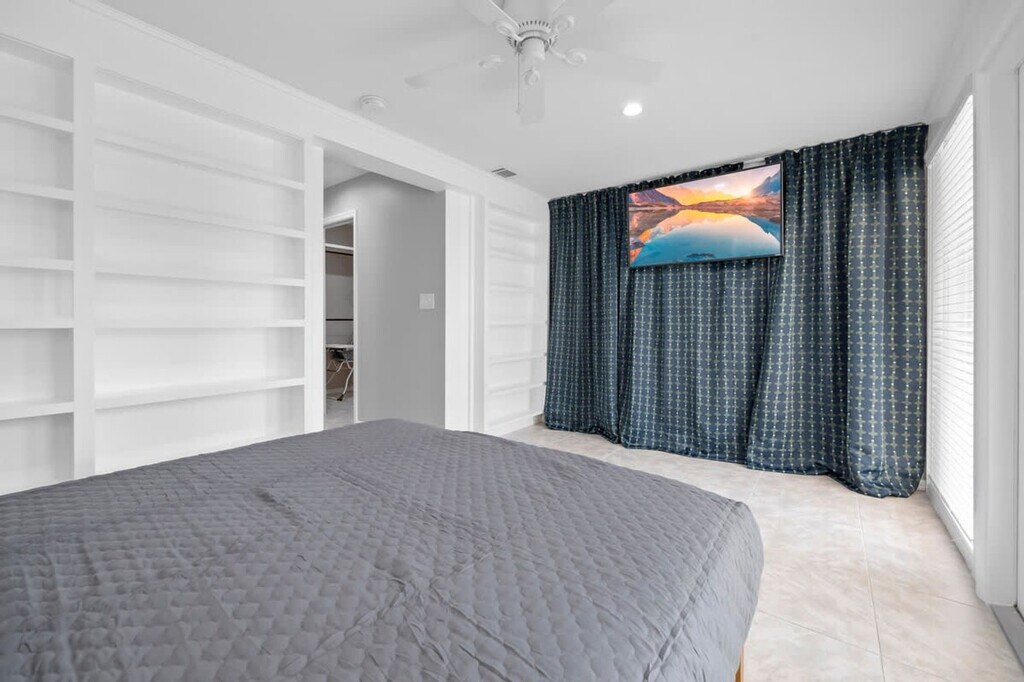 Welcome to this stunning 3-bedroom, 3-bath waterfront remodeled home in the heart of Cocoa Beach. With its screened-in pool area, putting green, and private dock offering picturesque sunset views, this is the perfect retreat for your beachside getaway. The home boasts a spacious open floor plan, featuring two living rooms. Catch all the excitement of the game on the big screen TV while the kids have a blast playing board games in the den. The large and updated fully stocked kitchen comes complete with a massive island, ideal for preparing delicious meals or simply enjoying a casual breakfast. After a day soaking up the sun, you'll appreciate the rejuvenation provided by the three beautifully remodeled bathrooms. And when it's time to rest, the three comfortable bedrooms ensure a blissful night's sleep. Pool heating is available at $50 per day and requires 24 hours notice for this amenity. Nestled in a charming and secluded Cocoa Beach neighborhood, you'll have access to a local park and nature walk, perfect for exploring the natural beauty of the area. Plus, you'll be within walking distance to a variety of restaurants and the downtown area, allowing you to easily immerse yourself in the local scene. For adventure seekers, take a short drive to Port Canaveral to embark on an unforgettable cruise or indulge in some delicious seafood. A visit to the renowned Ron Jon surf shop is also a must for any beach lover. Don't miss the opportunity to catch a rocket launch from the comfort of your own private dock or spend a day exploring the wonders of the Kennedy Space Center. Uber and Lyft are very prevalent in the area and the downtown area is within walking distance. An initial stock of essentials such as paper towels, toilet paper, tissues, coffee pods, creamer, sugar, light cleaning supplies, garbage bags, sponges, dish soap, and dishwasher tabs is provided. If you need additional supplies during your stay, please plan to replenish them as needed. Mailbox access is not available for guests and pets are not allowed. [SI]
