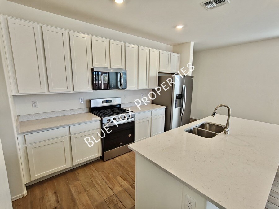 This stunning 3-bedroom, 2-bathroom brand-new single-story home is a must-see! It showcases a bright and spacious living room great for entertaining. The modern kitchen is a chef’s dream, featuring sleek white maple cabinetry, ample counter space, an island, a pantry, and stainless steel appliances. The den provides the perfect space for a home office or creative projects. The spacious primary suite offers a walk-in closet and a private bath with a shower and an extended dual-sink vanity. All bedrooms now have ceiling fans. Enjoy relaxing or entertaining on the covered patio, which overlooks the backyard and a view fence. The backyard is enhanced with pavers and rock landscaping. Washer and Dryer are "as-is" and won't be repaired or replaced by the owner. This home is available now for a 1-year lease. The rental rate is $2,095.00 per month, and the security deposit is $2,095.00. Blue Fox Properties is an Equal Opportunity Housing provider. We are also licensed REALTORS.