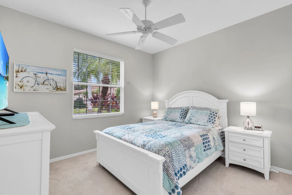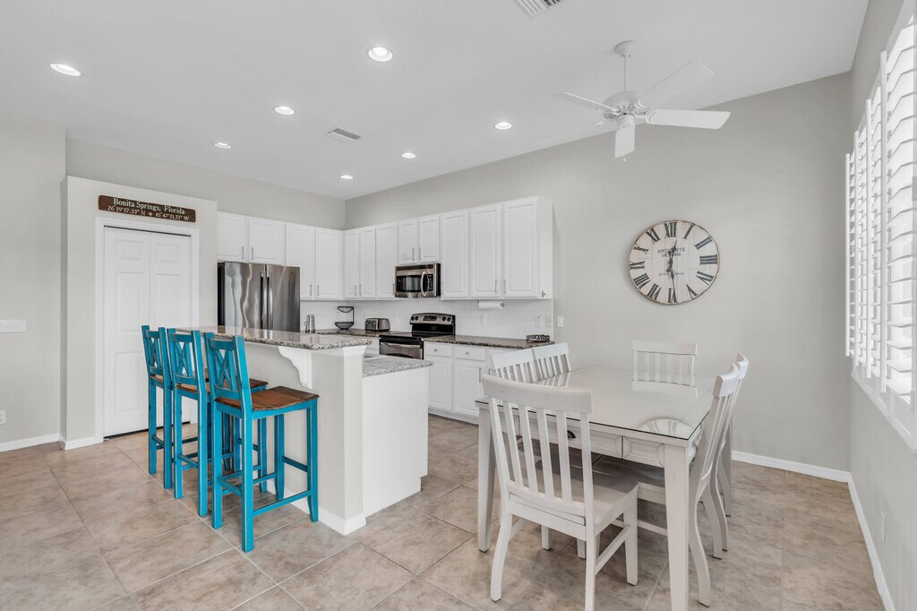 Feel at home in this seasonal rental home in Marbella of the gated golfing community of Spanish Wells. This single-family home features an open concept floor plan designed for modern living, allowing you to enjoy both indoor and outdoor spaces. The kitchen features granite countertops, stainless steel appliances, and both informal and formal dining areas. Guests can enjoy al fresco meals on the lanai while sitting poolside in the covered and screened pool deck area, and can use the propane grill. Additional living spaces include a well-appointed family room with comfortable furnishings and a large wall-mounted TV. There is also a full-sized laundry room with a modern washer and dryer. Enjoy gorgeous views of the golf course from the pool, lanai, family room, kitchen, and main bedroom. There is a private heated pool at the home, along with a neighborhood pool within walking distance. Guests can walk through the garage and access beach chairs, bikes, and pool toys. Please note that this home does not have any membership for any of the onsite amenities. Spanish Wells has a public golf course. The community is within walking distance of the Sunshine Plaza, which has Zorba's Greek and Mediterranean food, Smash Fitness Gym, The Stage Restaurant and Dinner Theater, and the Bonita Beach Balloon Bar and Grill. Bonita Beach is located less than 4 miles from the main entrance of Spanish Wells off of Bonita Beach Road. The Fort Myers International Airport is a quick 25-minute drive from the home. Quiet hours are between 10 PM and 8 AM. Please do not rearrange the furniture. Please report any damage or malfunction to the host right away so that they can repair or replace the damaged item. Pets are not allowed. The pool at this home is heated to 85 degrees when appropriate, but the temperature can fluctuate depending on local weather conditions. Access to the property cannot be given until HOA approval is received prior to your move-in along with the second payment. This is a self-check-in property, and you will receive the codes to check in once full payment and HOA approval have been received. Registration Number: Florida state permit number: #DWE2102775 [SI]
